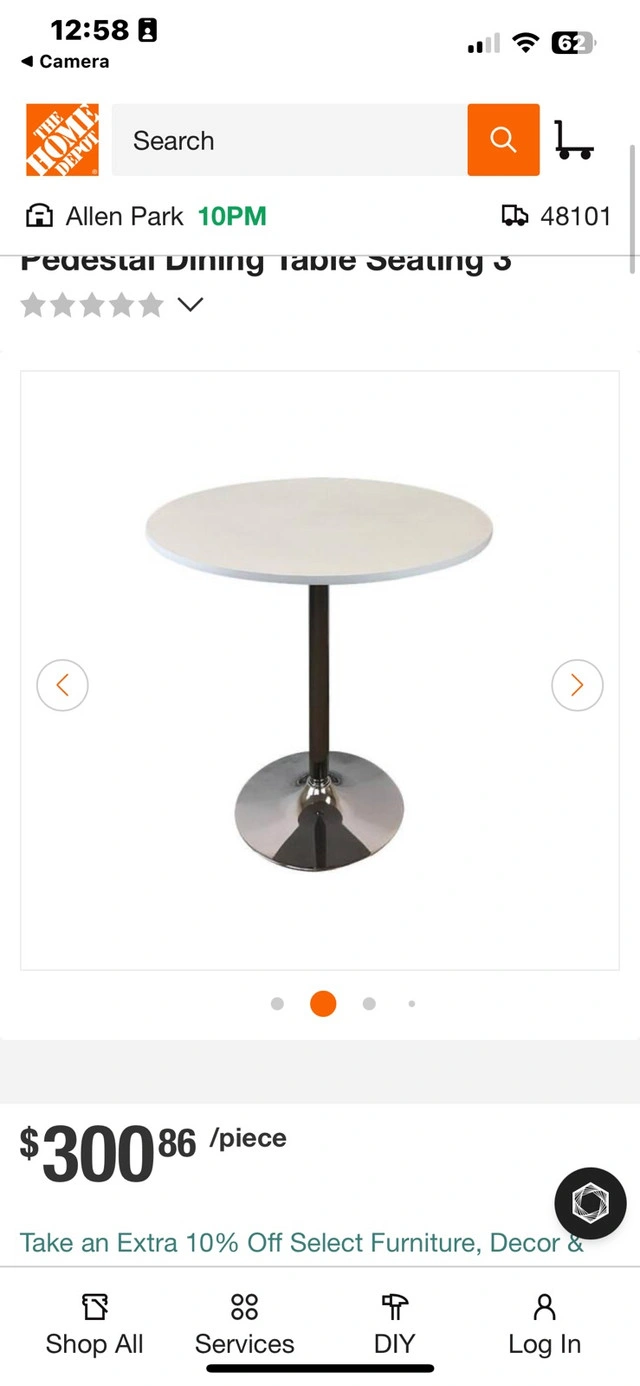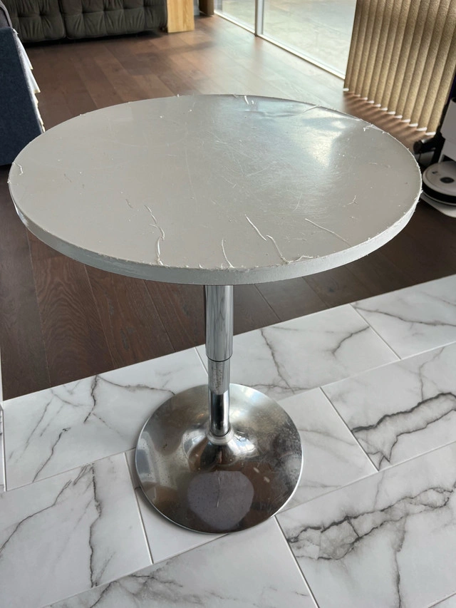 91Add a touch of mid-century modern flair to your space with this tulip-style side table! This table features a round white top and a sleek chrome pedestal base, perfect for small spaces. The table is used, and the top has some noticeable wear and tear, but it's still a sturdy and stylish piece. Here are the specs: * **Style:** Mid-Century Modern * **Shape:** Round * **Base Material:** Chrome * **Top Colour:** White