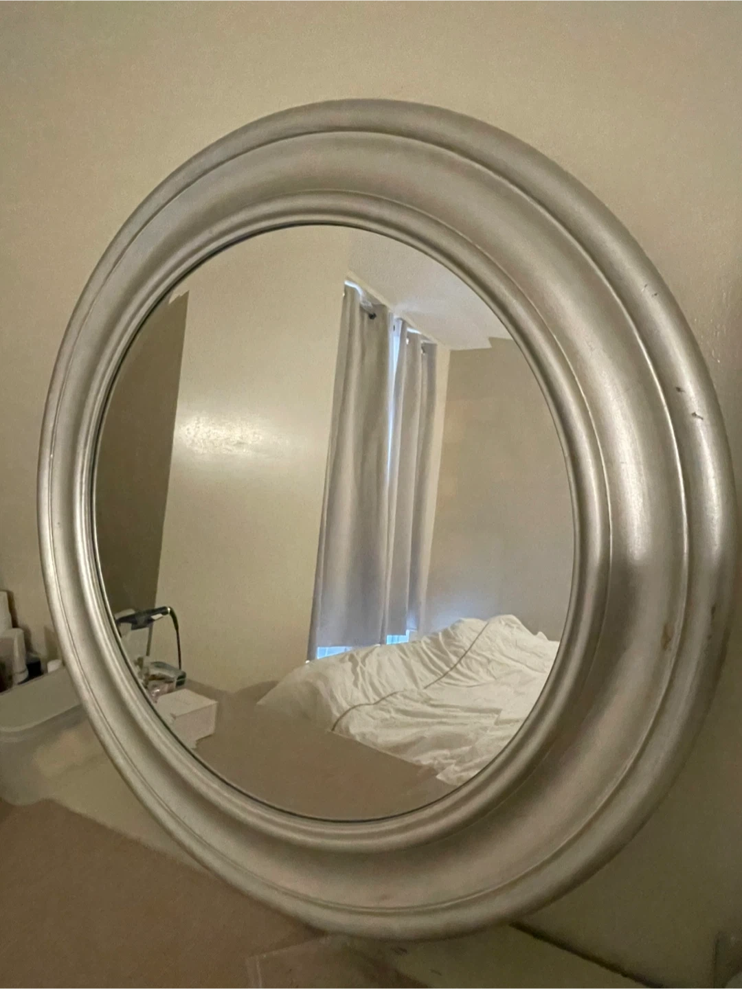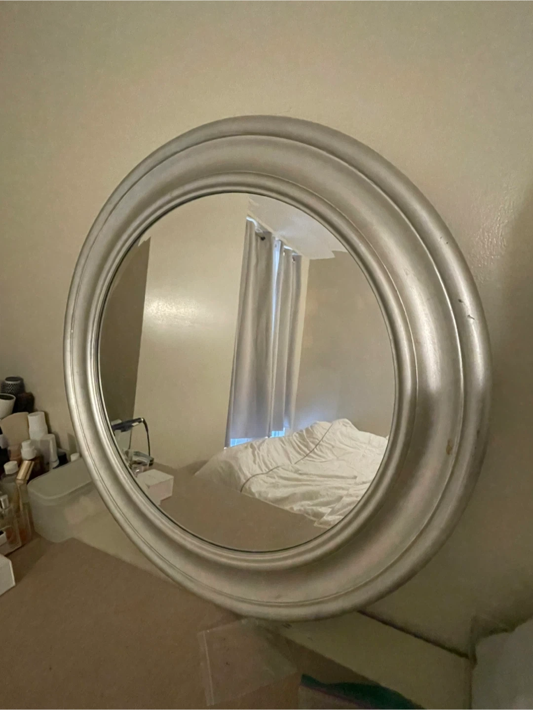 80Large round solid mirror with wooden frame- purchased from HomeSense. Good condition, will give it a wipe before handing off