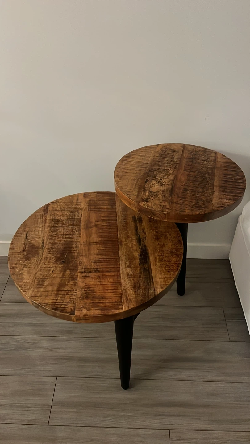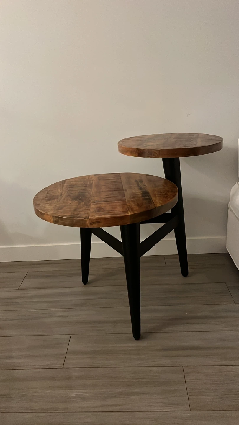 25Selling a unique round two-tier side table! It's perfect for adding a touch of rustic charm to any room. The wooden top has a lovely grain, and the black legs provide a nice contrast. It's in great condition and ready for a new home