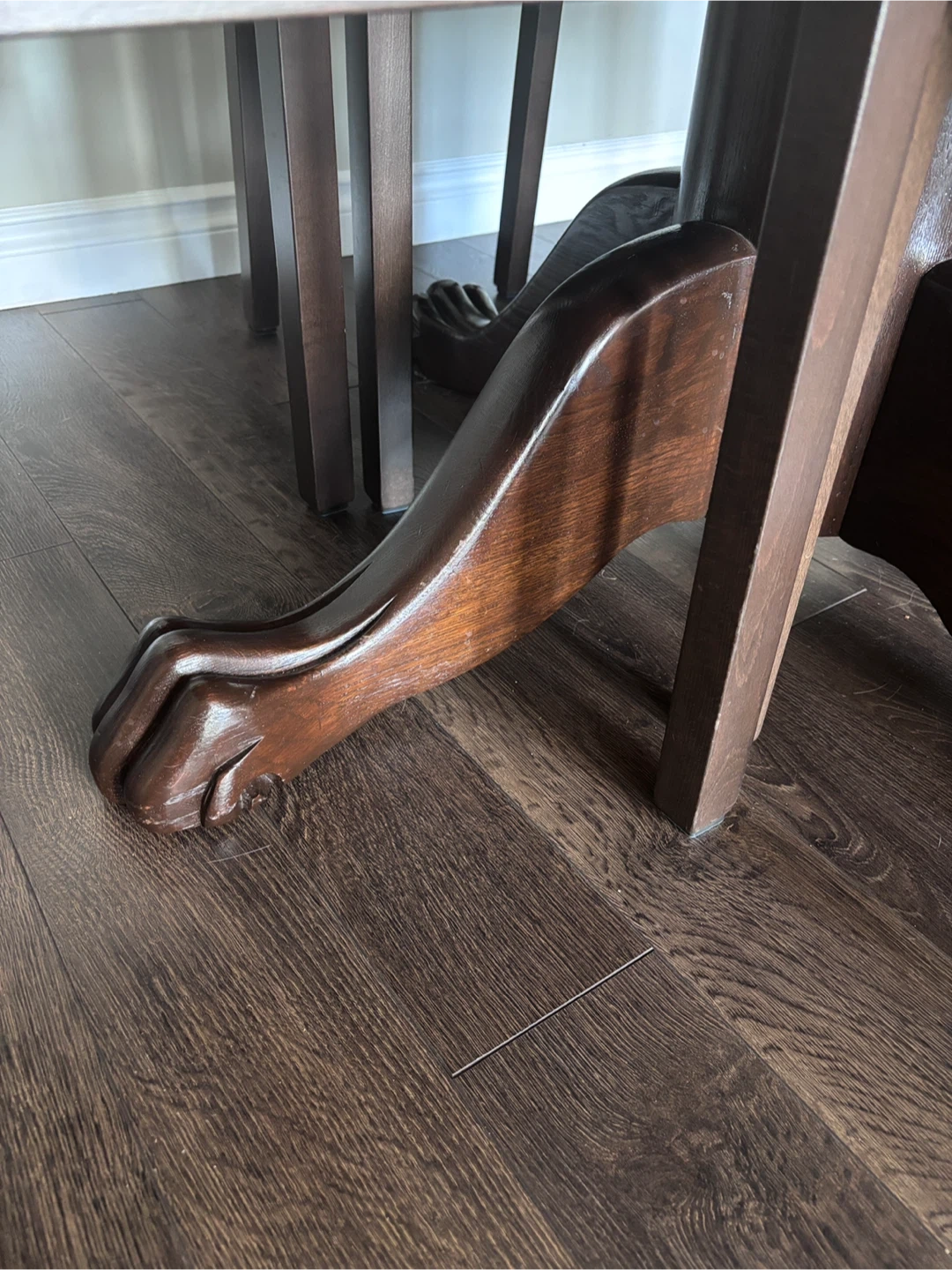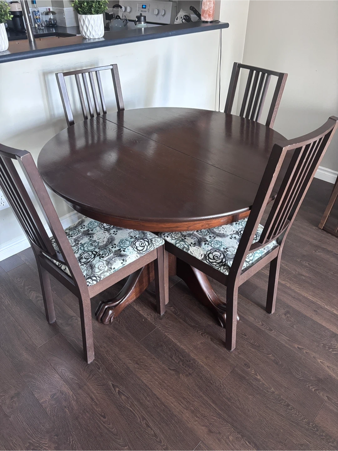 Solid oak round table with six matching chairs. This table includes two 12-inch leaves, expanding from 44-inches round (perfect for cozy dinners) to 68 inches long (great for hosting family and friends). Currently finished in a dark walnut stain, the surface does have some wear and will need to be refinished - but the good news is that oak is easy to strip and restain, so you can truly make it your own. One of the most unique features of this table is the Lions paw feet on the legs. What could sound a little over the top actually adds a touch of vintage charm and character - making this table stand out from the rest. ✨ solid oak construction (heavy and durable) ✨ expandible with two 12-inch leaves ✨ 6 matching chairs included (not original chairs; chairs were purchased from IKEA) Perfect for someone who loves quality furniture with personality, and who’s open to a simple refinishing project to bring it back to life . 📍pickup in Langley City (203 & 54) 💲asking price $100