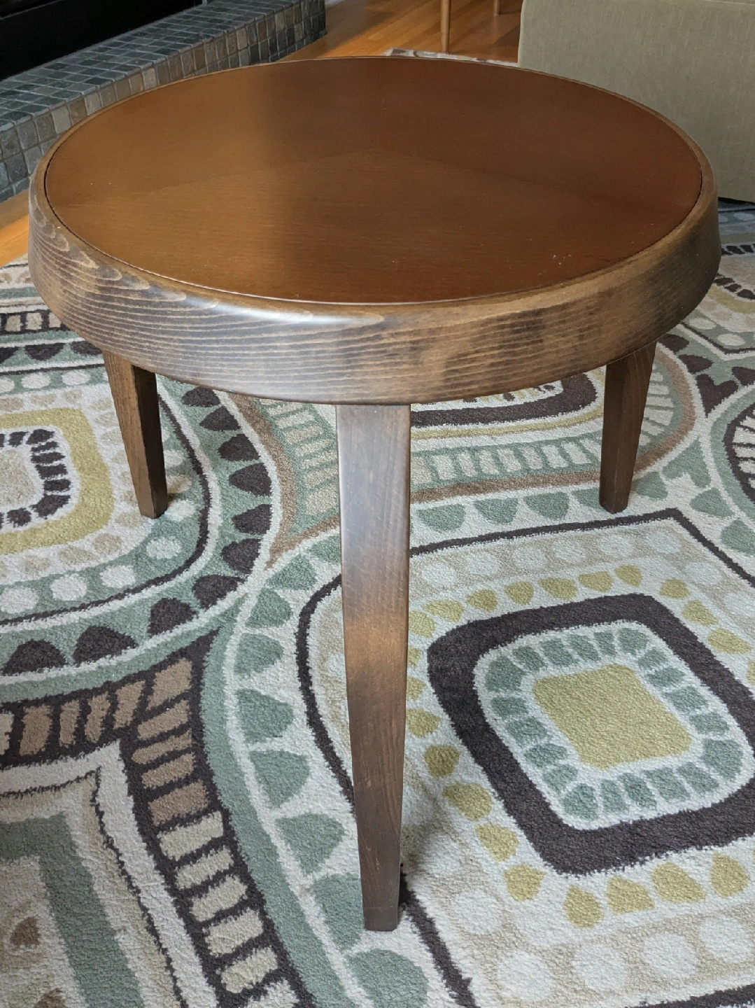 142A lovely round coffee table with a rich, dark wood finish. It's perfect for adding a touch of warmth to your living room. The table is sturdy and in great condition! A great addition to any home and measures 20" in diameter x 20"H.