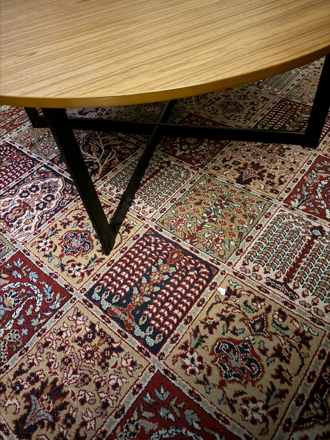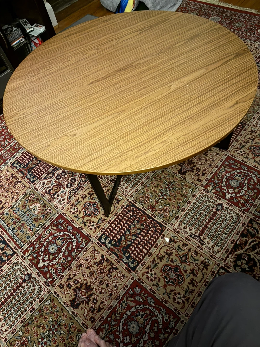 Selling a round wooden living room table. It features a light wood finish on the tabletop and black metal legs. The table is in good condition and would be a great addition to any living room space!