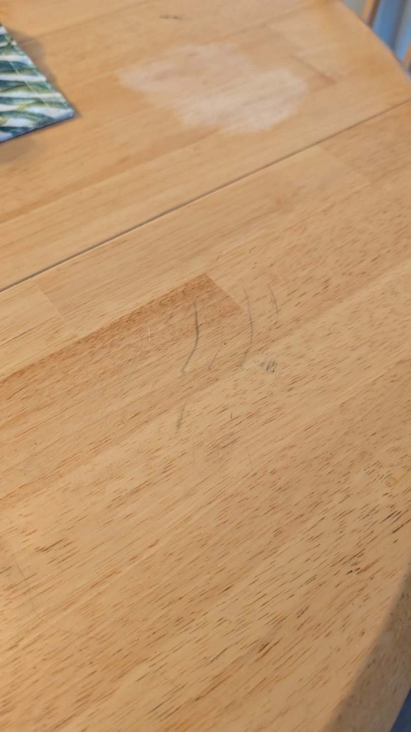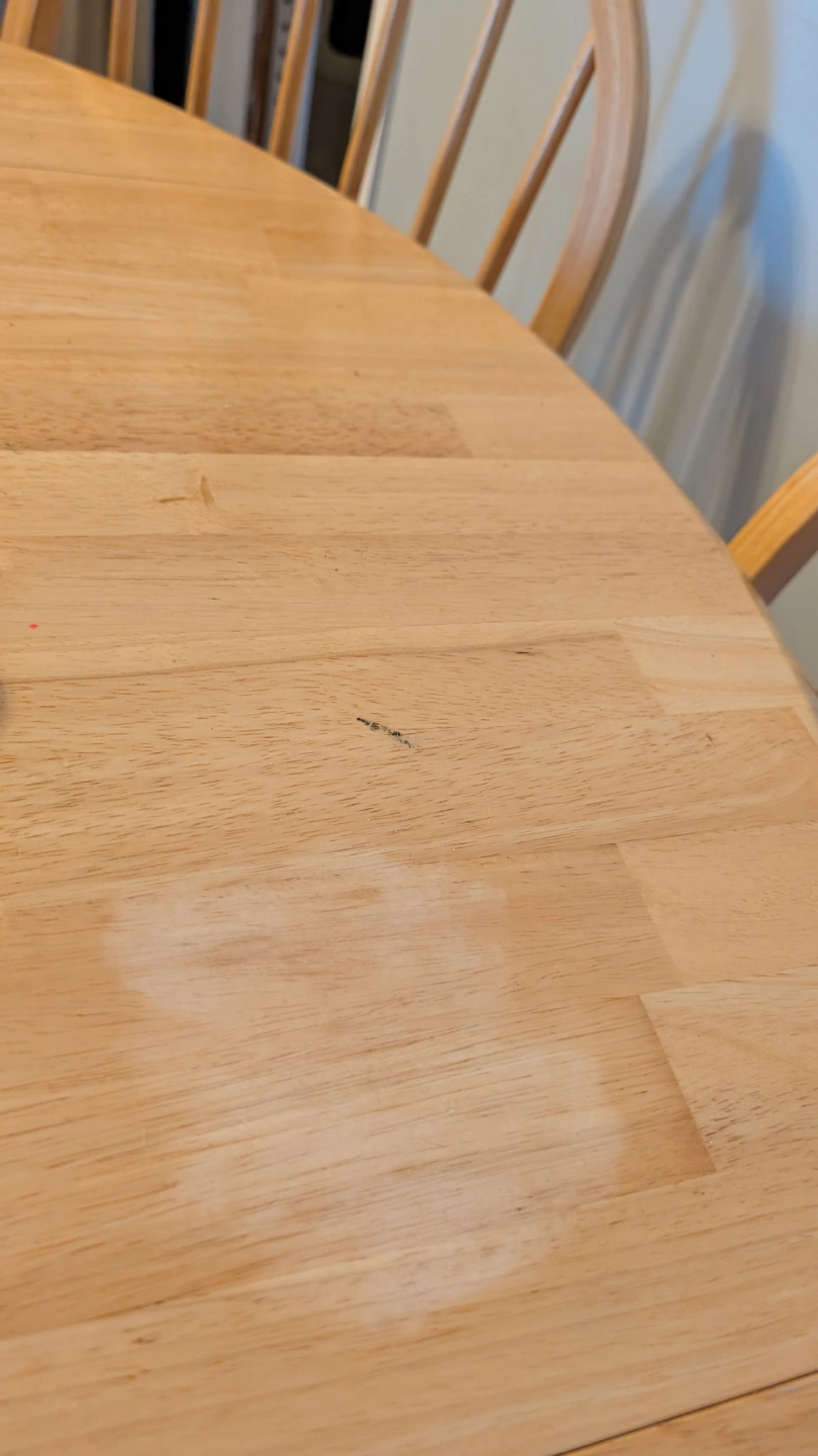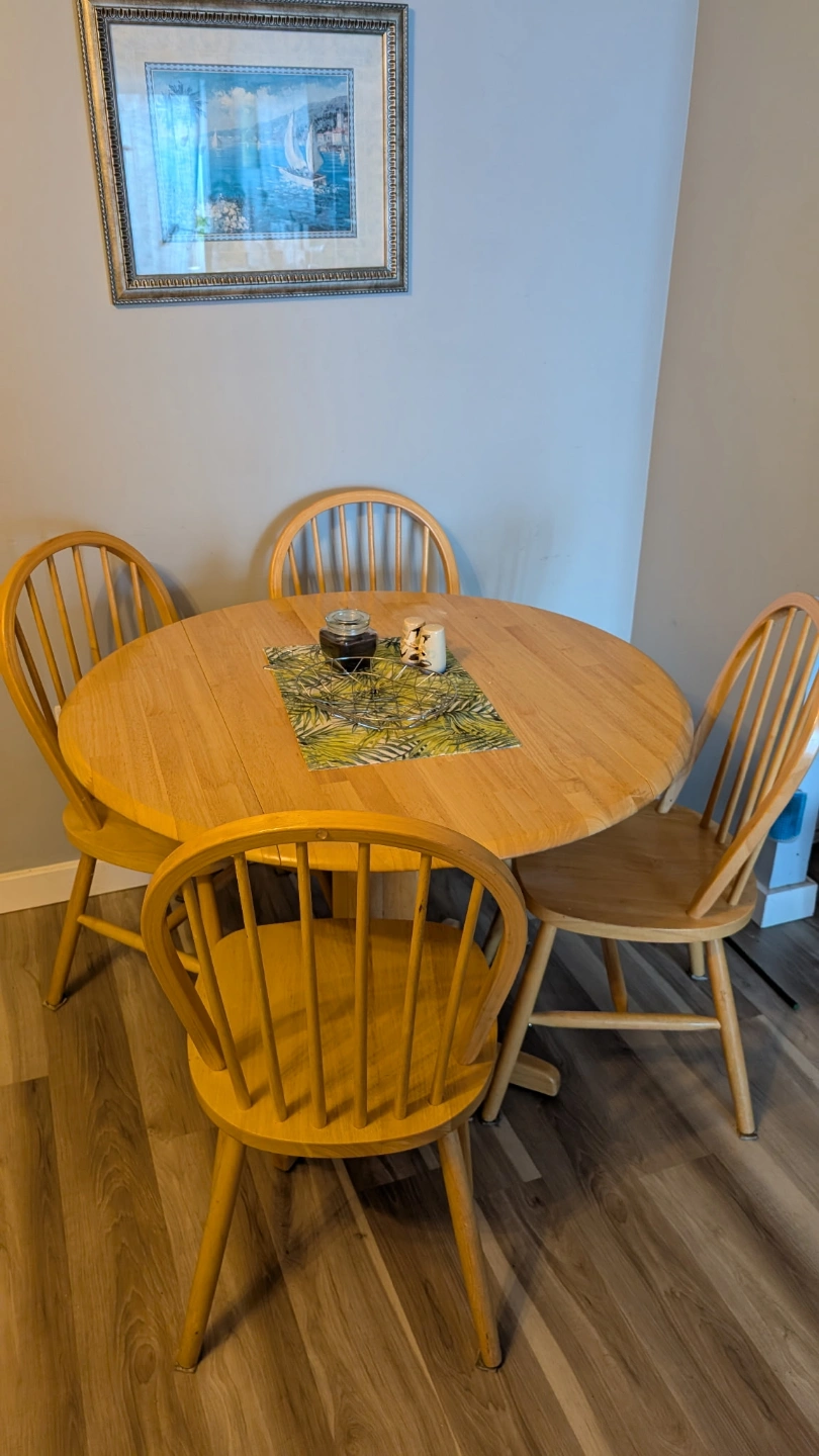 10Four-chair dining set. Light coloured wood. Some minor surface scratches and marks on tabletop. Solid wood construction. Good condition, shows some minor wear.