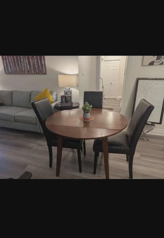 0Selling a round wooden dining table that comes with three chairs. The table has a drop-leaf design, perfect for smaller spaces. The chairs are upholstered in a dark colour, complementing the table nicely. It's a great set for a cozy dining area!
