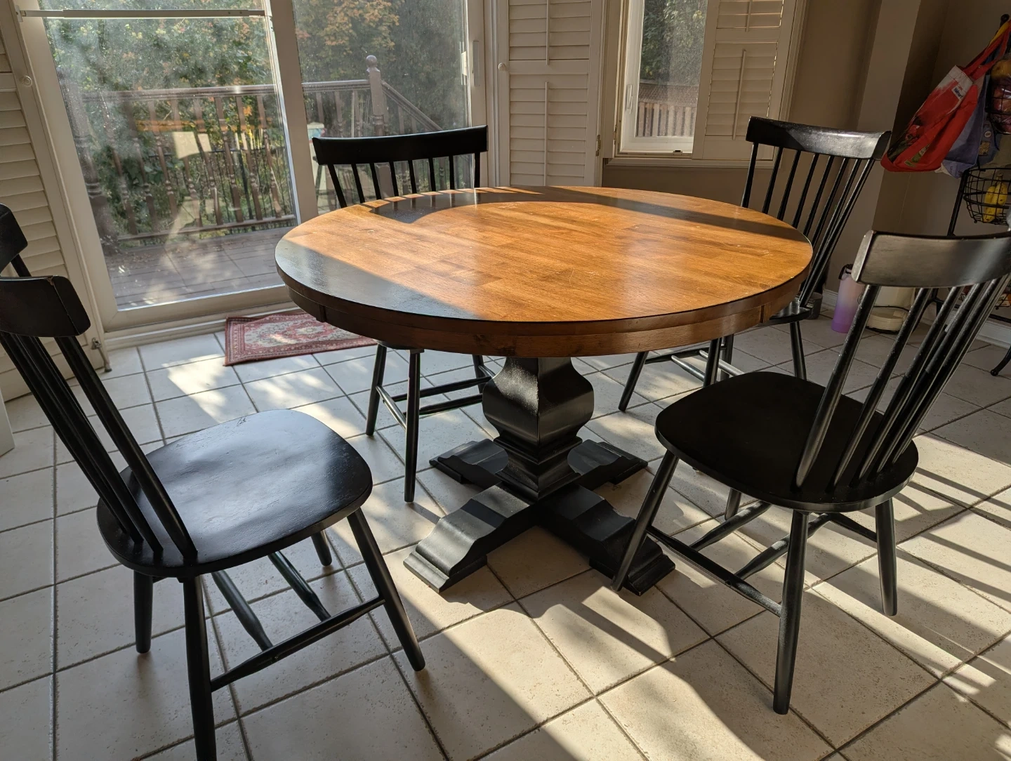 10Selling a round wooden dining table(Aliha Rubberwood) that comes with four chairs(Matanna solid wood). The table features a pedestal base and the chairs are a classic spindle-back design. Perfect for a cozy dining space!