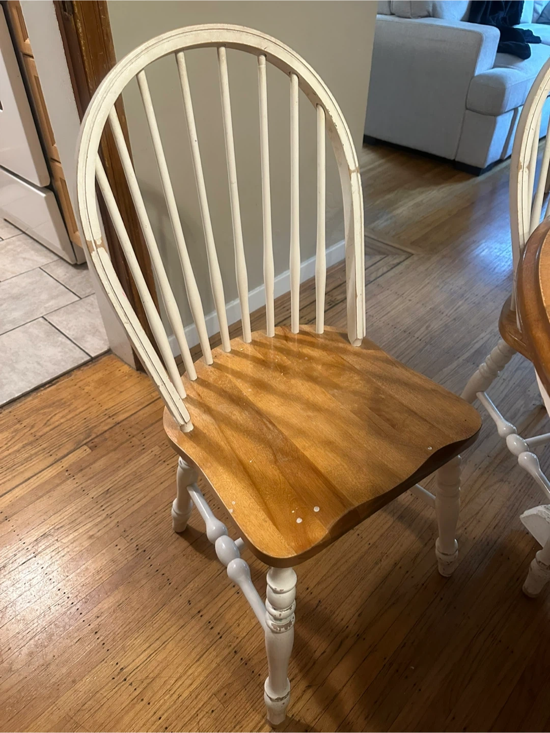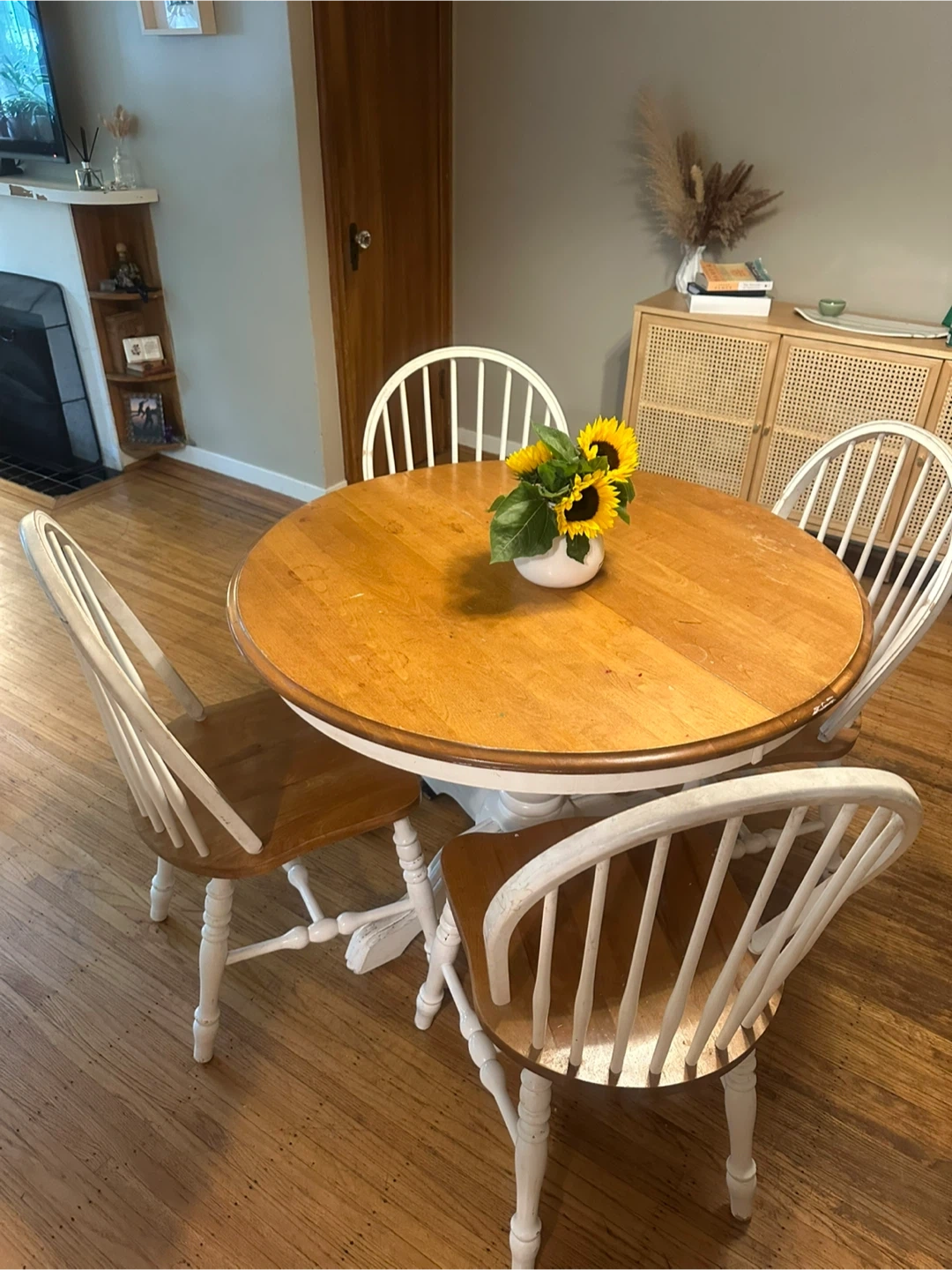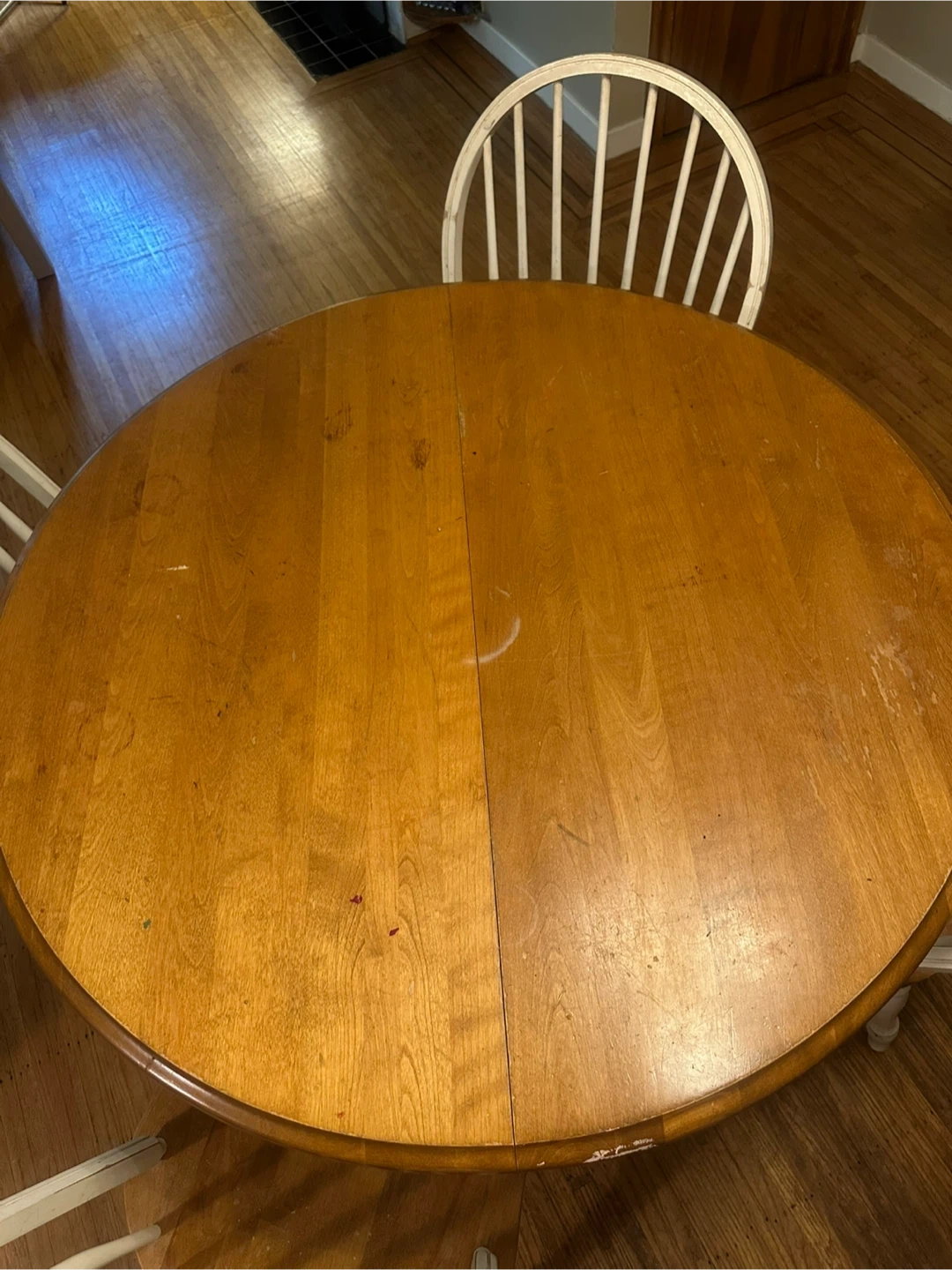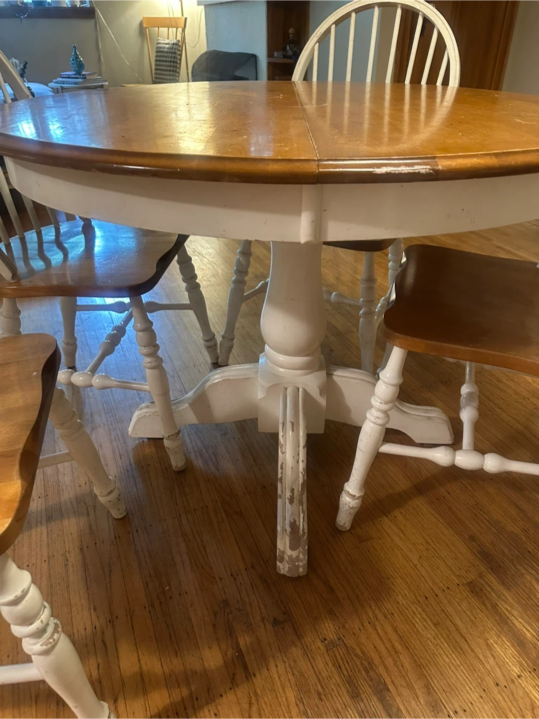 Selling a round wooden dining table with four matching chairs. The table comes with 2 additional leaves to extend. Would benefit from a fresh coat of paint, but overall it's in good condition and ready for a new home!