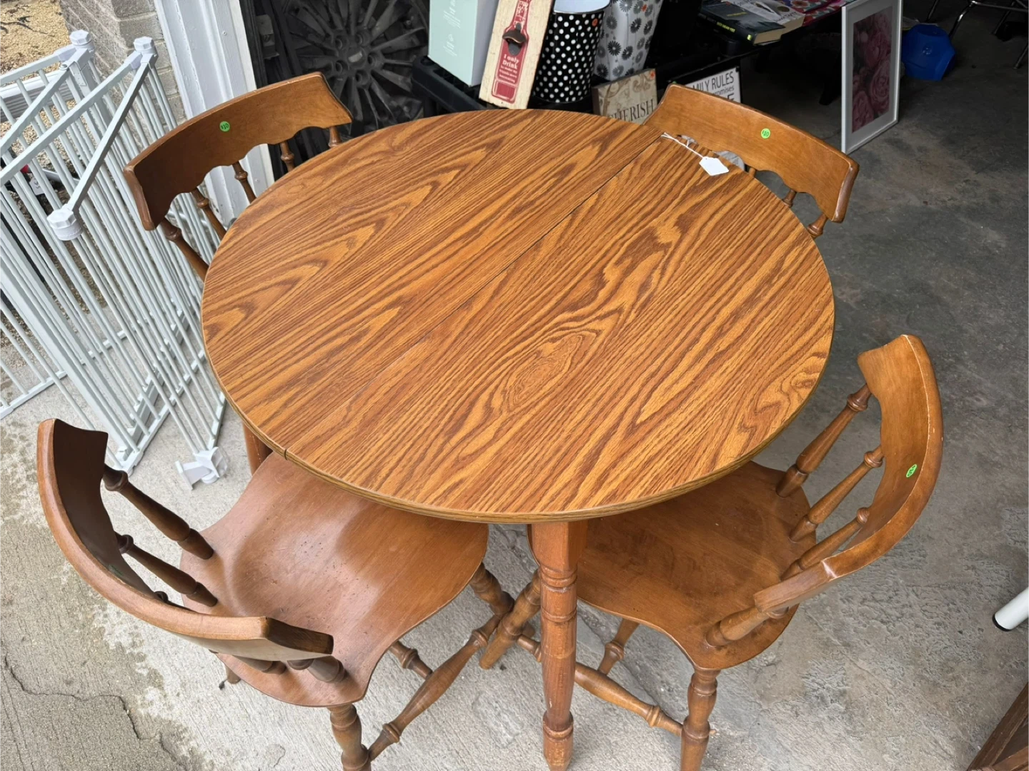 Selling a round wooden dining table with four chairs. It's a great set for a smaller dining area.The table and chairs show some signs of use, but are still sturdy and functional. Perfect for a starter home or apartment! It is extendable but Extension is missing for the middle.