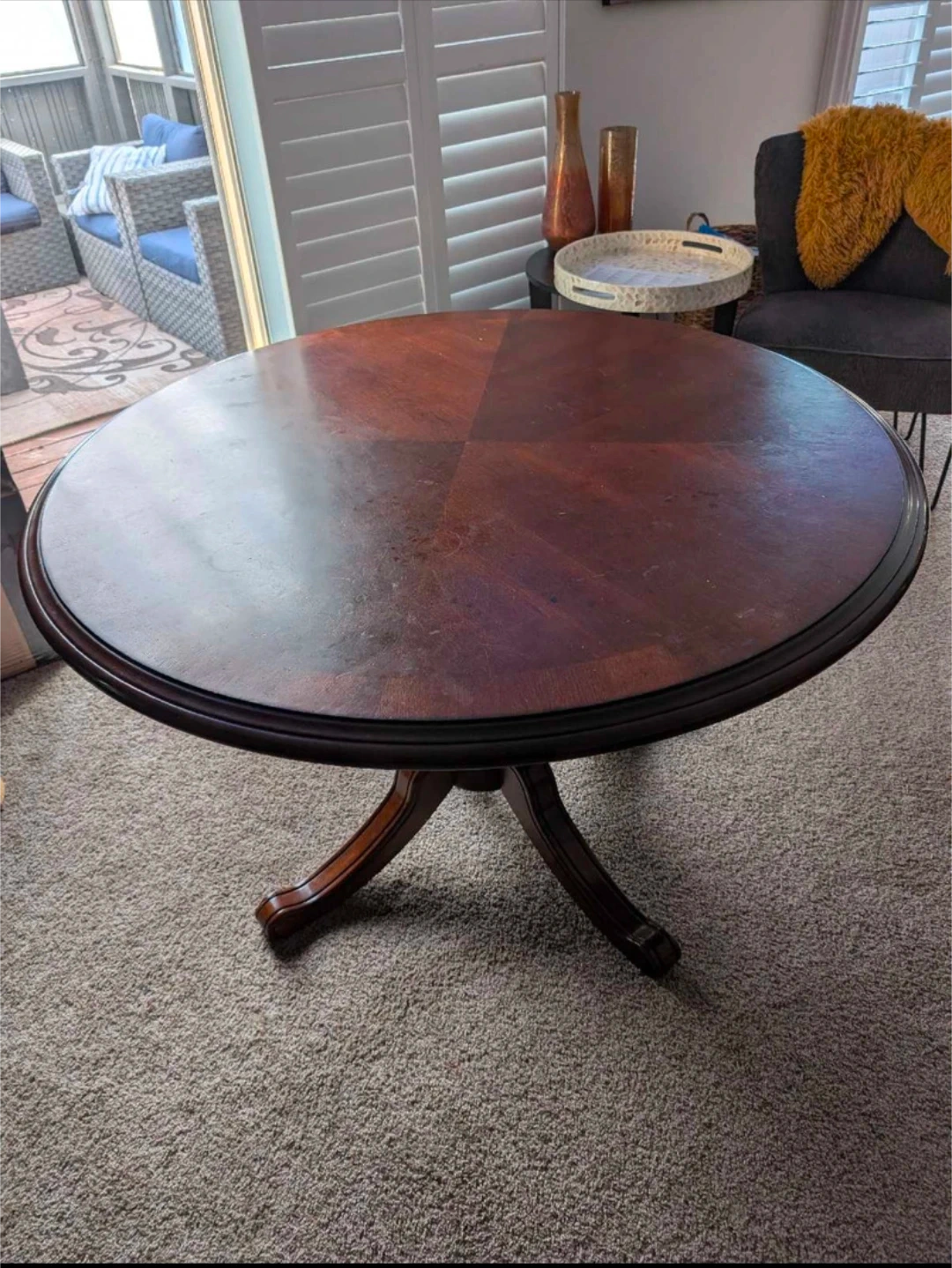 0Selling a round wooden table with a pedestal base. It's a lovely piece that would look great in a dining room or kitchen. It has a dark wood finish and a classic design. There are some signs of wear, but overall it's in good condition and ready for a new home!