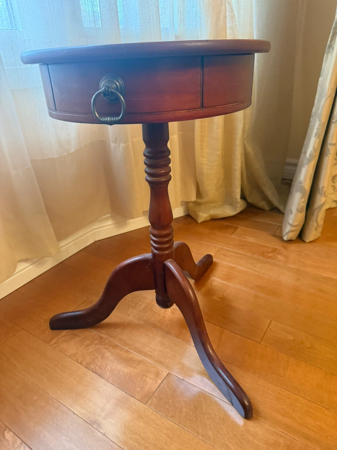 66Selling a lovely round wooden side table! It has a beautiful, classic design and a handy little drawer for storage. The wood has a warm, rich tone that would complement any room. It's in great shape and ready for a new home