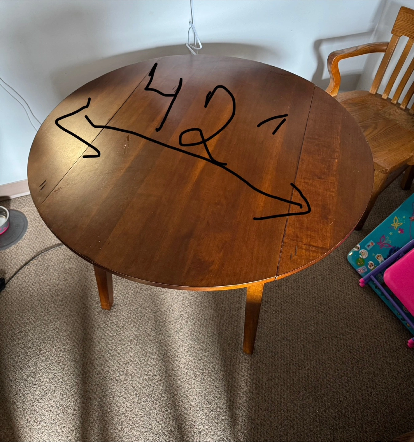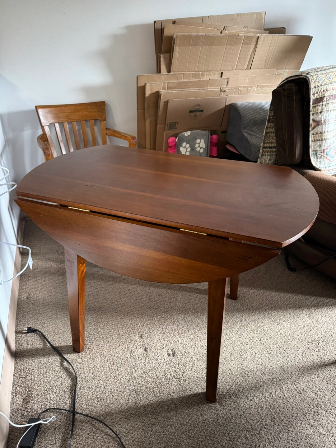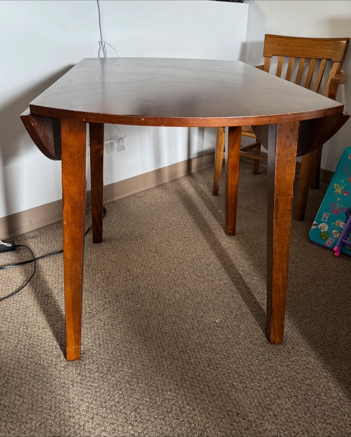 Drop leaf round wooden table that could be perfect for your living space! It measures 42 inches across when leaves up. It's in used good condition and ready for a new home.