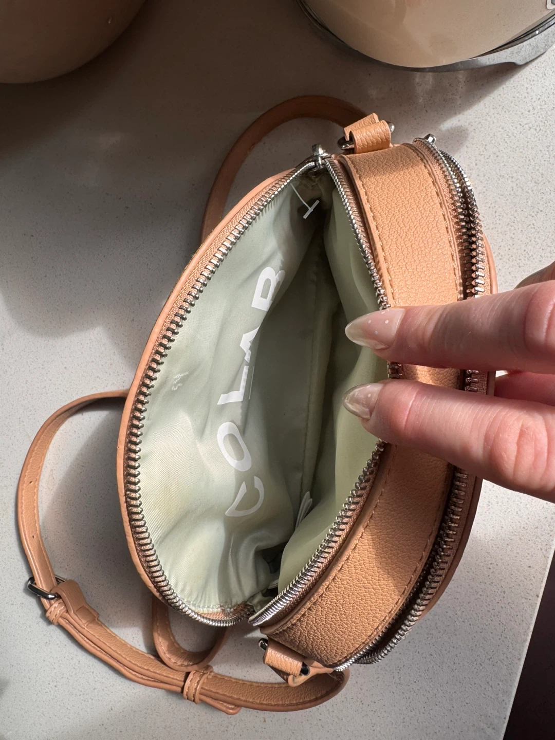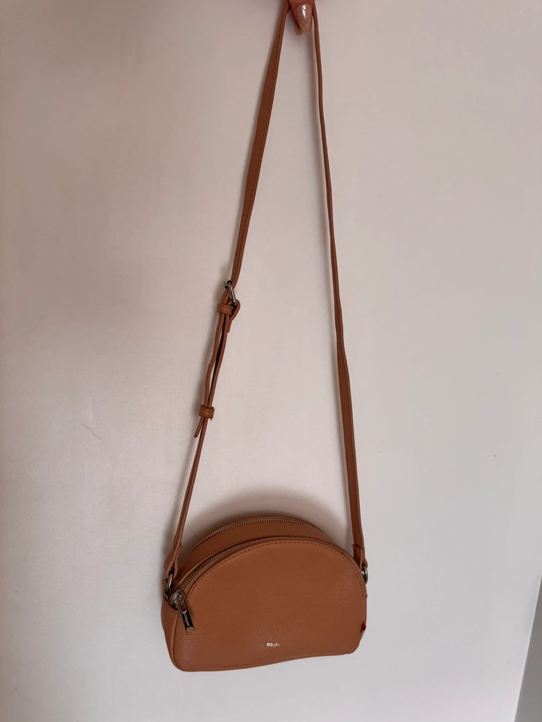 This is a tan faux leather half moon crossbody bag from Colab. It has a zip closure and an adjustable strap. Interior lining is a pale green. Small mark on the inside that needs to be cleaned and little scratch that’s not noticeable on the back