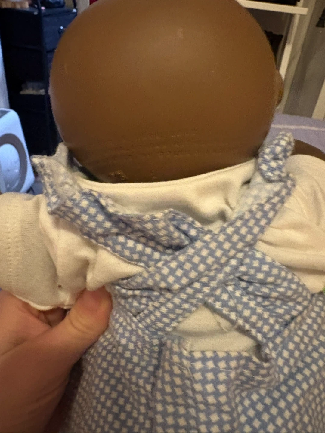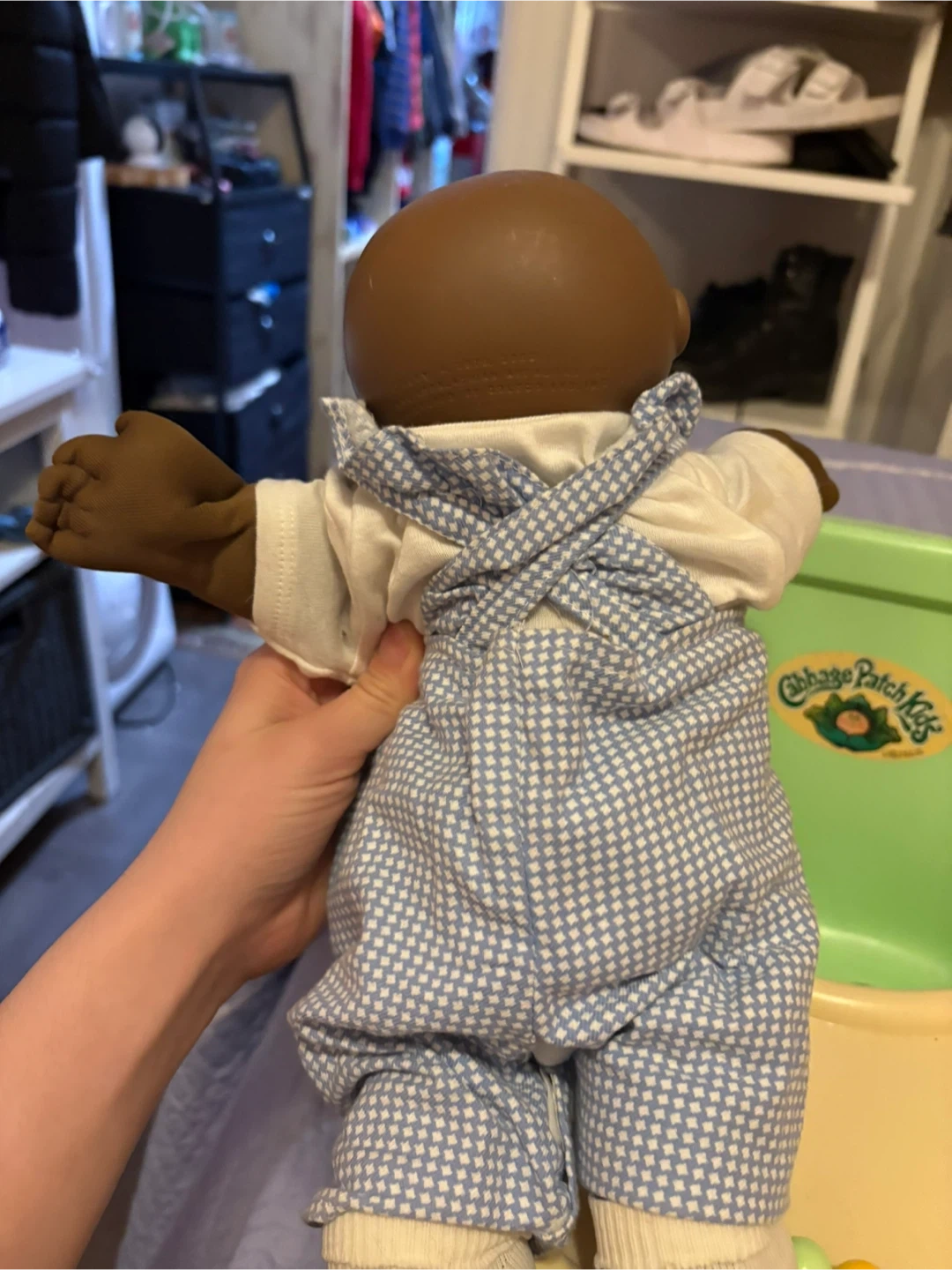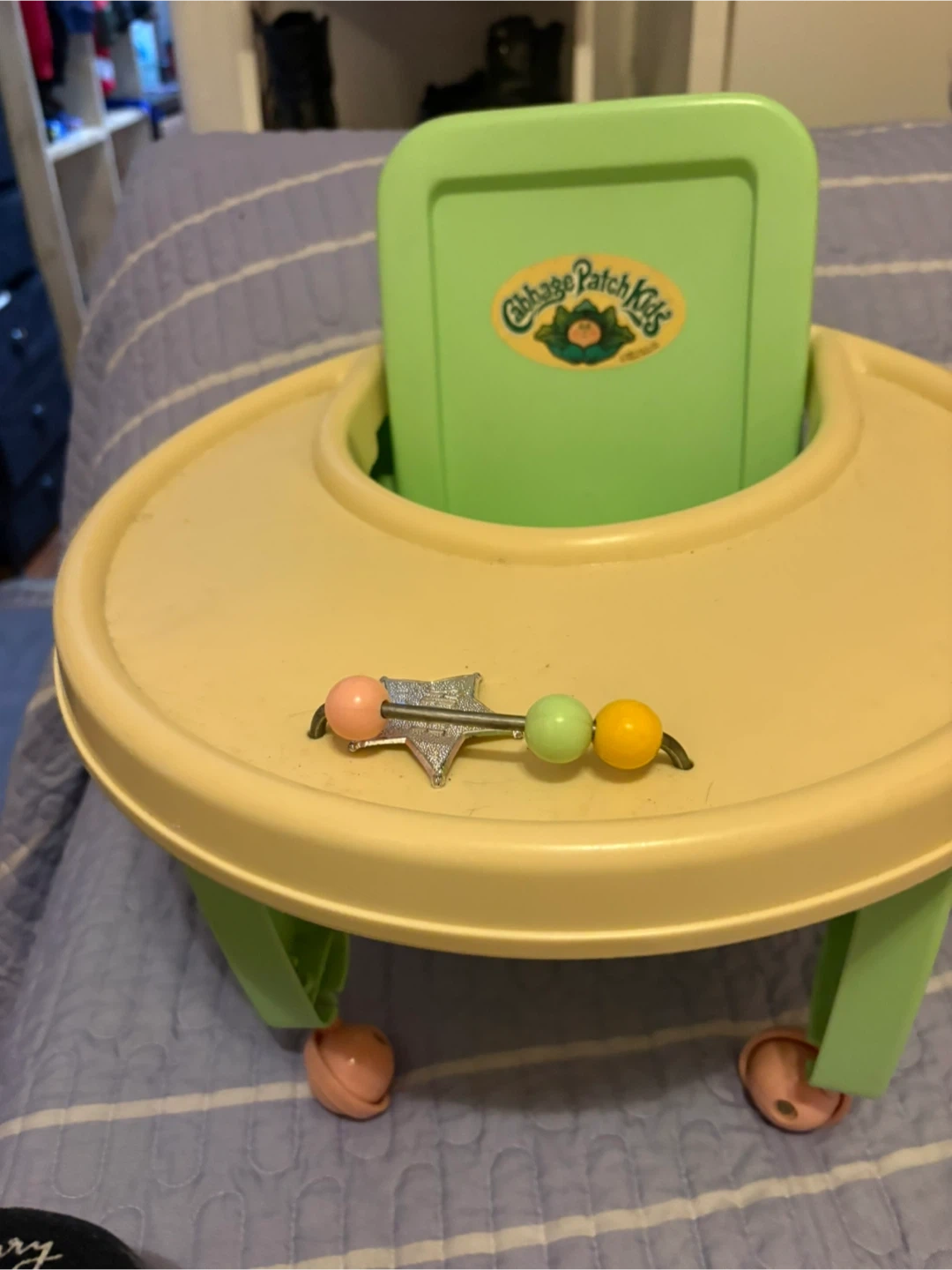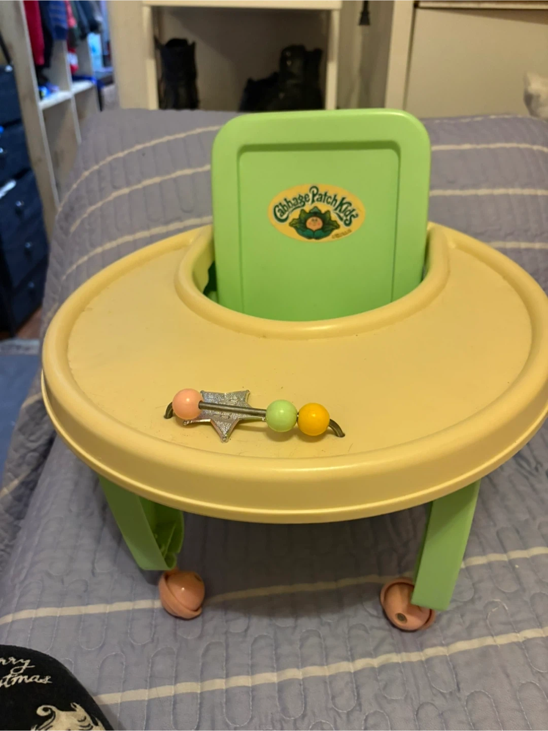 Cabbage Patch Kids doll with a walker! The doll is wearing a blue and white checkered outfit. The walker is yellow and green and has a toy attached to the front