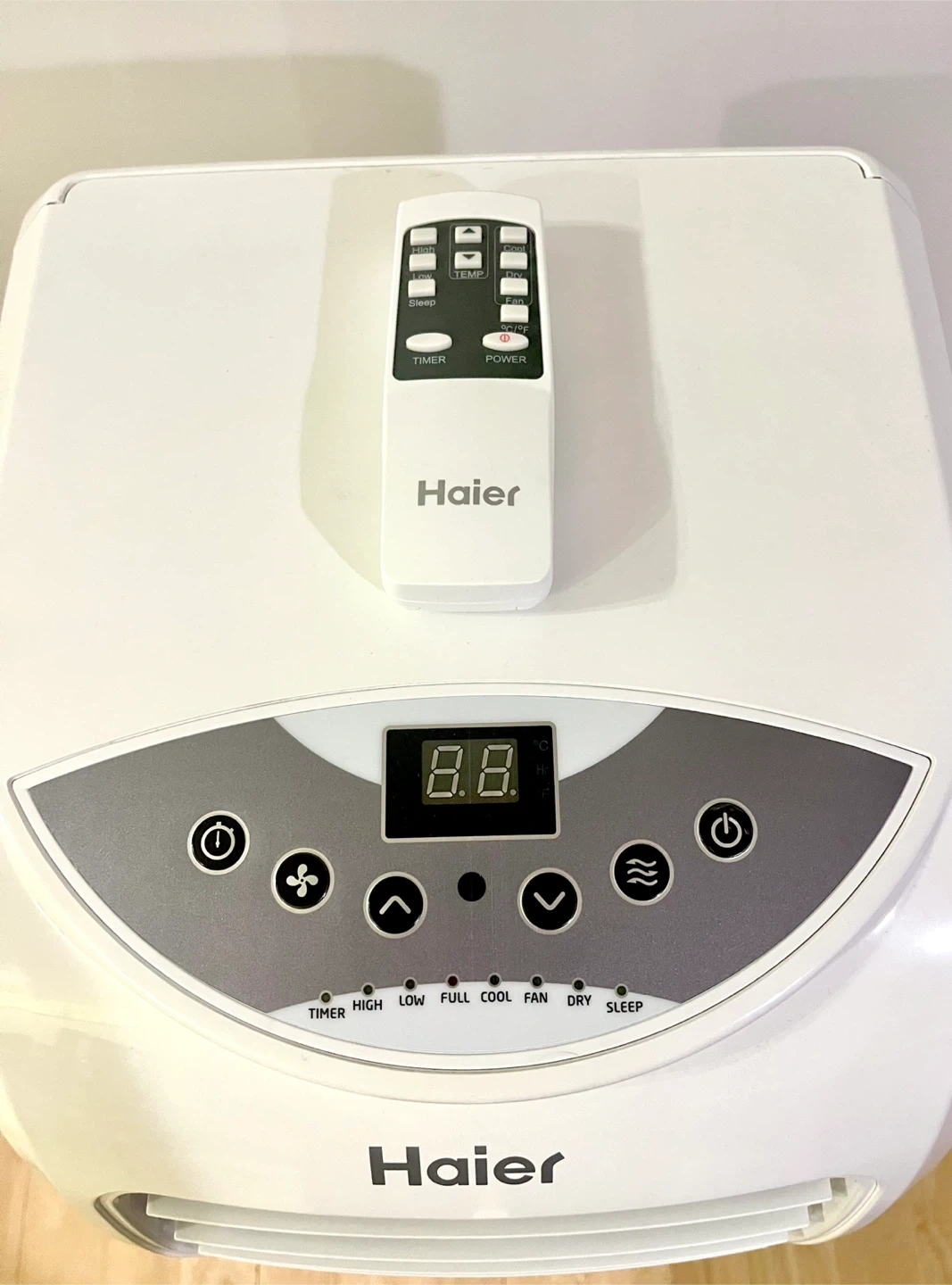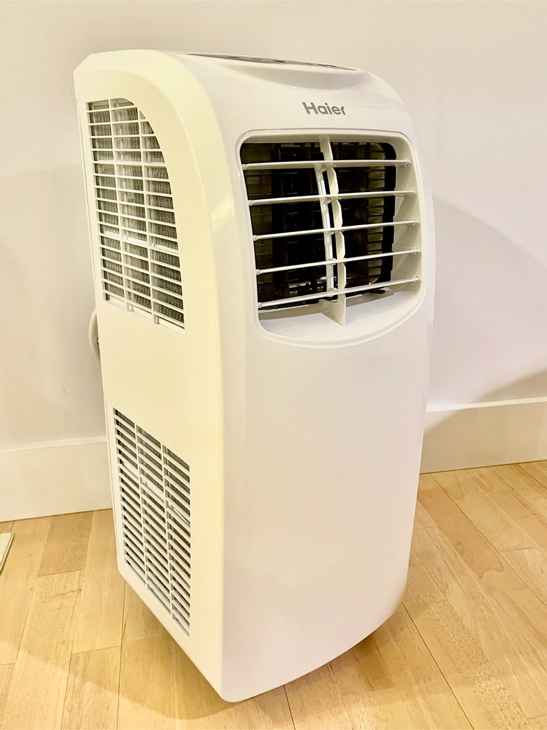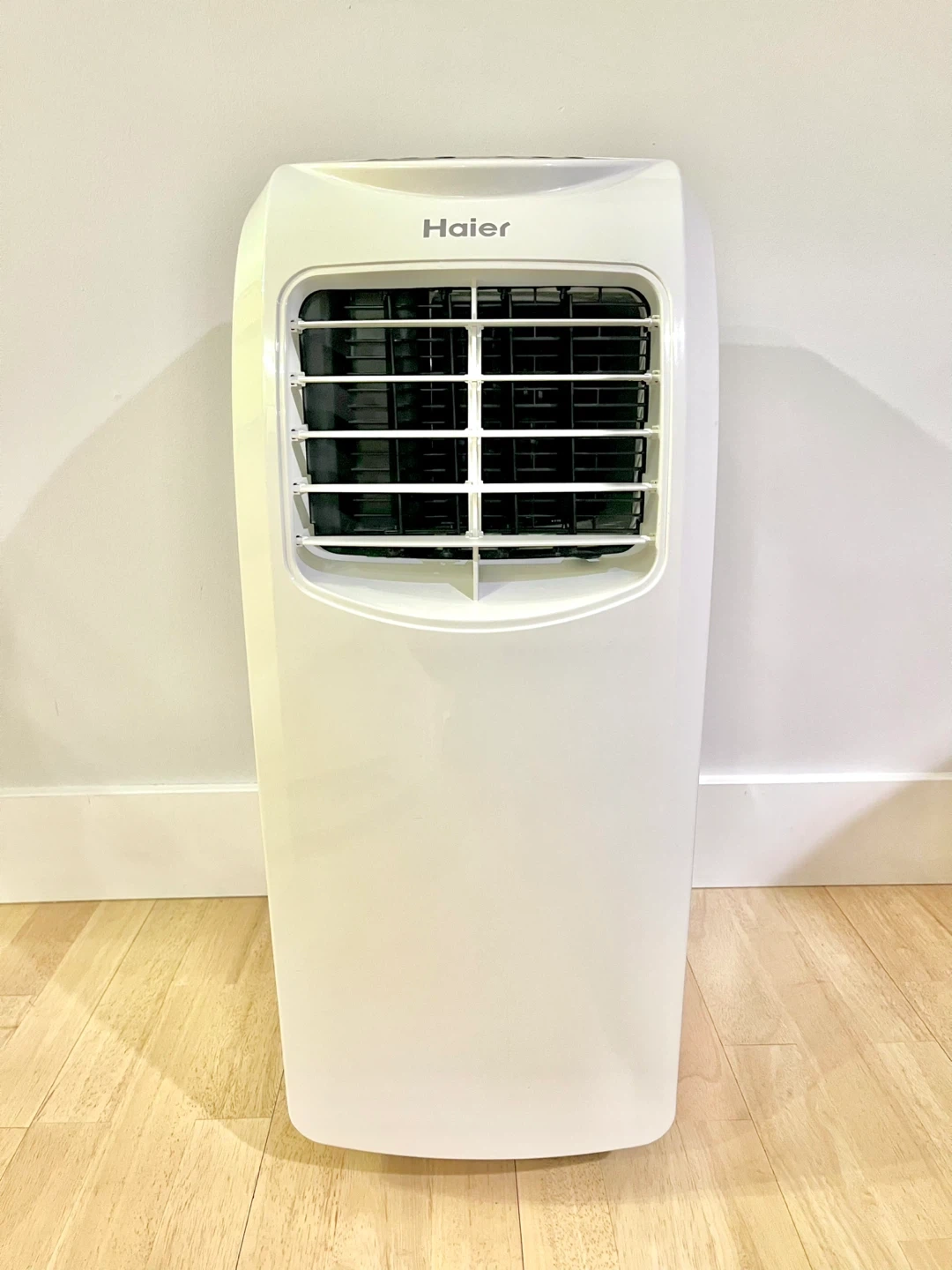 A compact, 3-in-1 Haier portable AC unit that functions as an air conditioner, fan, and dehumidifier.