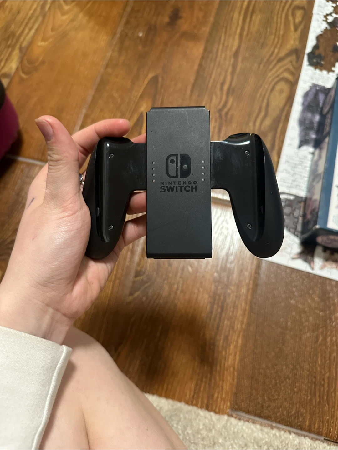 This is a Nintendo Switch Joy-Con charging grip. It allows you to charge your Joy-Con controllers while you play. It's black and made of plastic. This accessory is useful for extended gaming sessions.