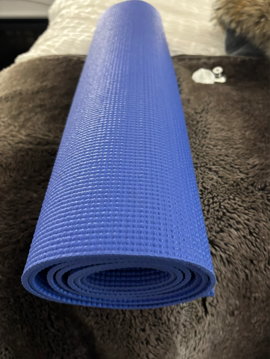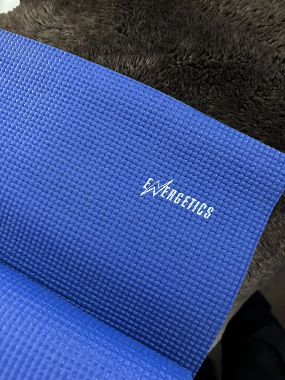 Blue yoga mat by Energetics. Textured surface for grip. Provides cushioning for your workouts. Great for yoga or general fitness routines!