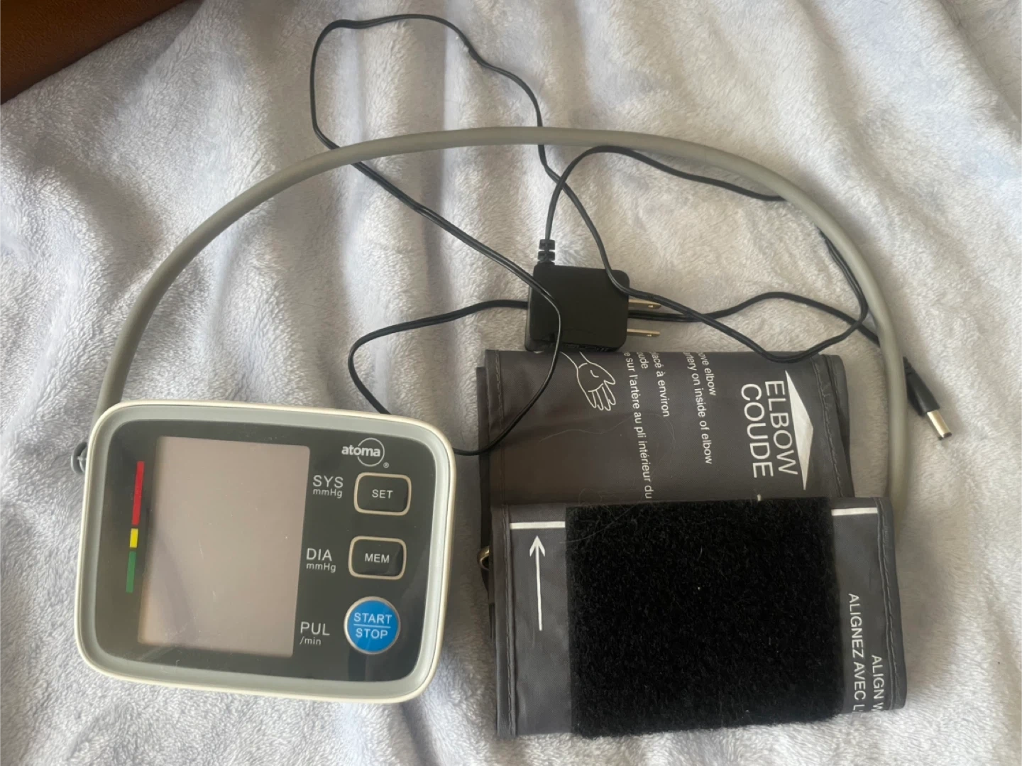Atoma digital blood pressure monitor with an arm cuff. Includes the main unit, arm cuff, and AC power adapter. Measurements are displayed in mmHg for systolic and diastolic pressure, and BPM for pulse.