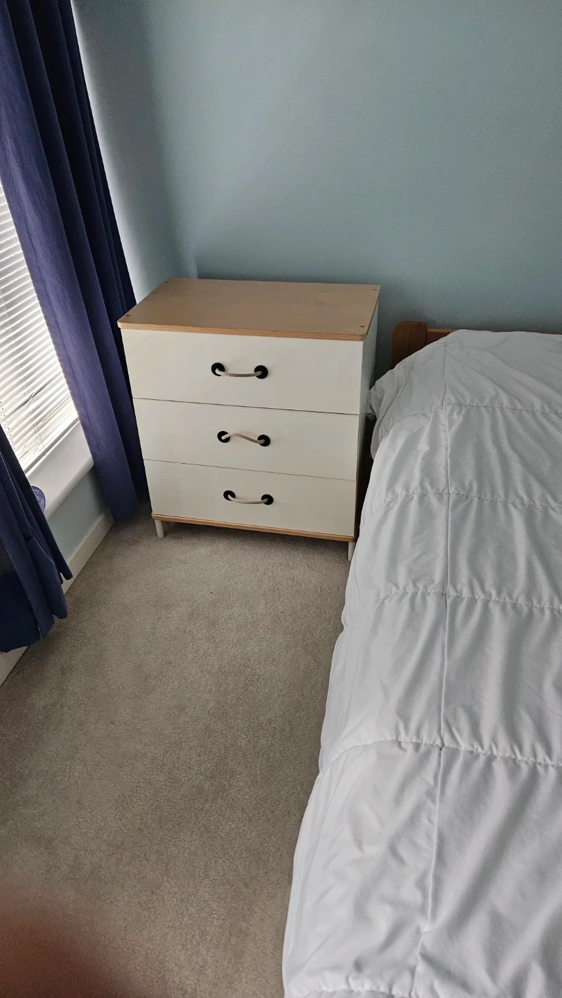 White dresser with a light wood top and rope drawer pulls. It has three spacious drawers for storage. A nice compact piece for any bedroom!