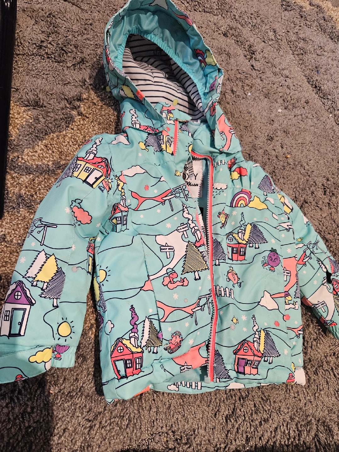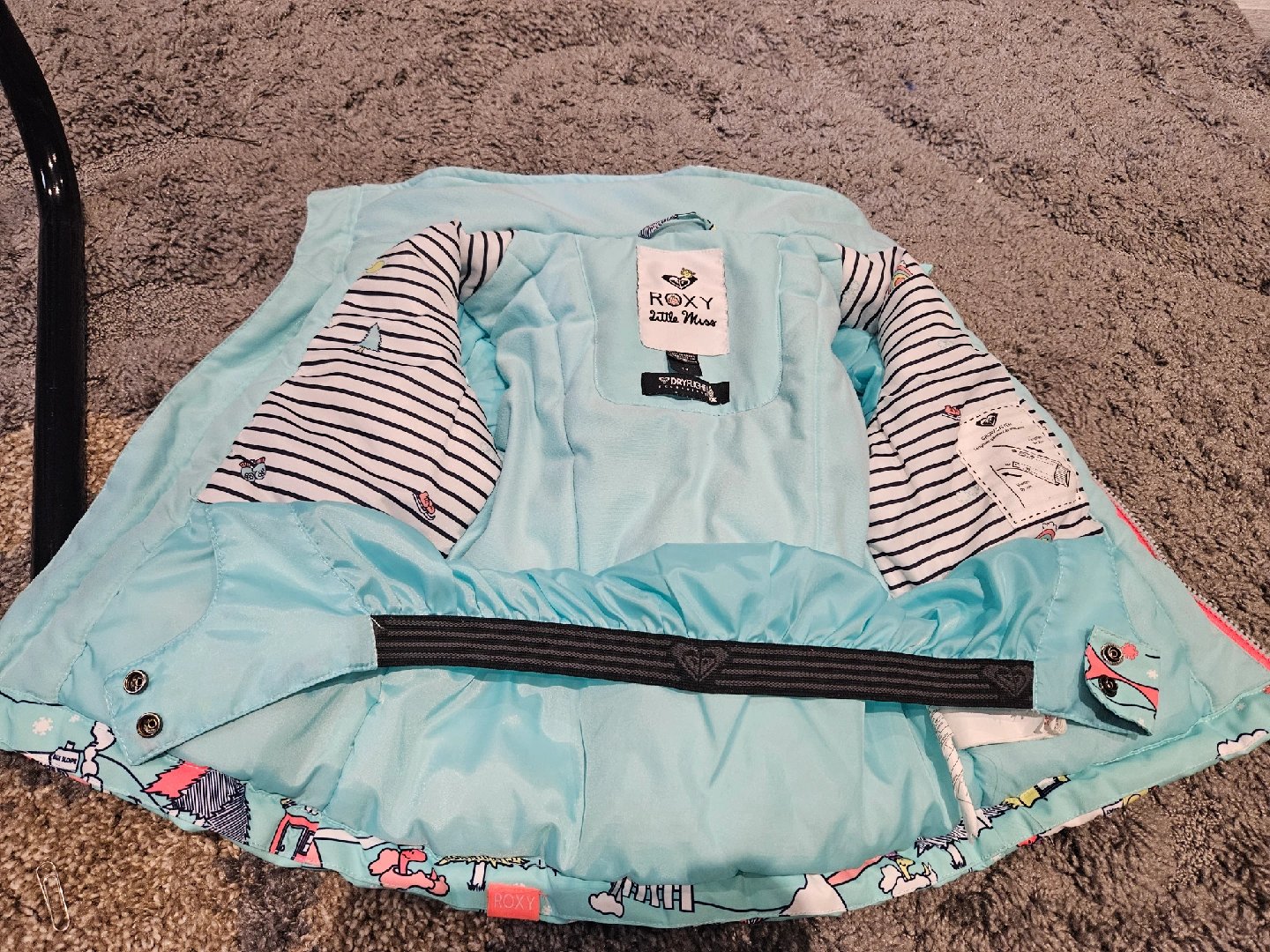 Keep your little one warm and stylish with this Roxy Little Miss snow jacket! It's a size T2 and features a fun, colourful design with houses, trees, and rainbows. Perfect for hitting the slopes or just playing in the snow. Fits up to size 3. No rips or stains.