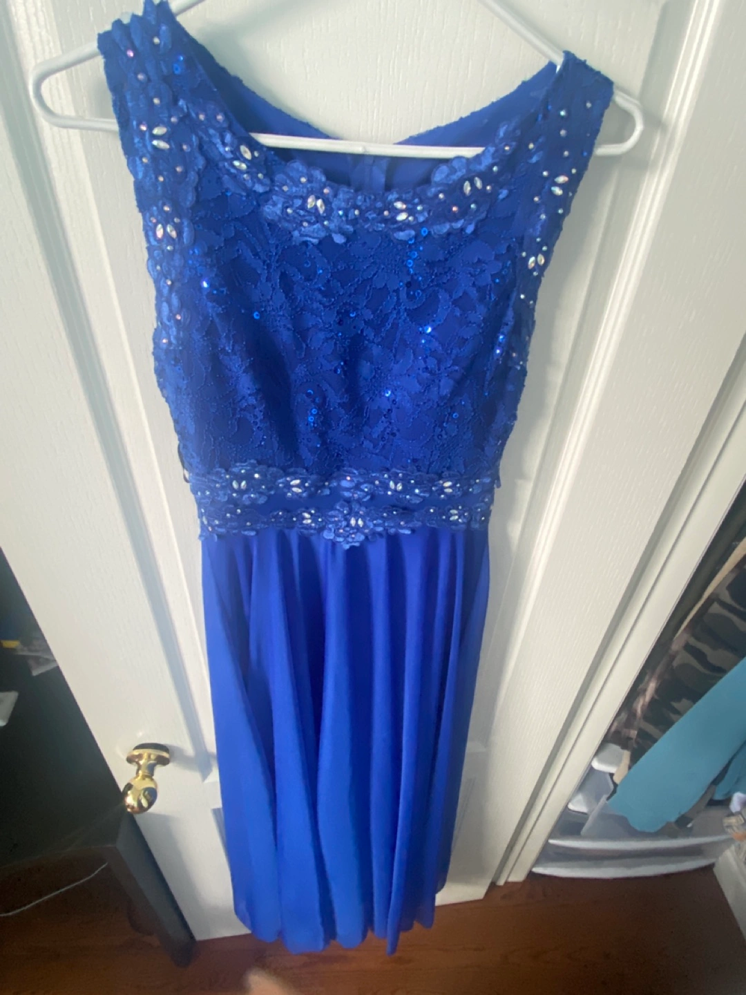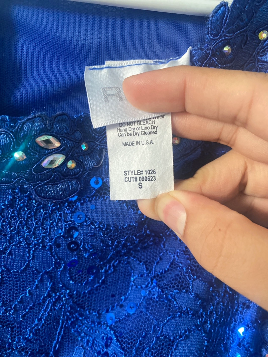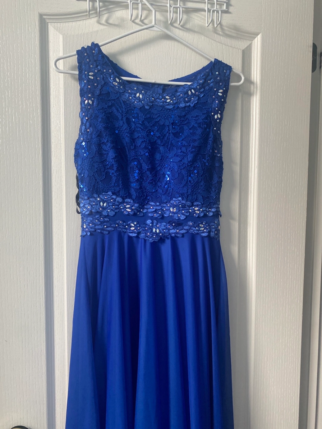 45Beautiful royal blue formal dress. Features lace bodice with sequins and embellishments. A-line skirt. Size small. Made in the U.S.A.