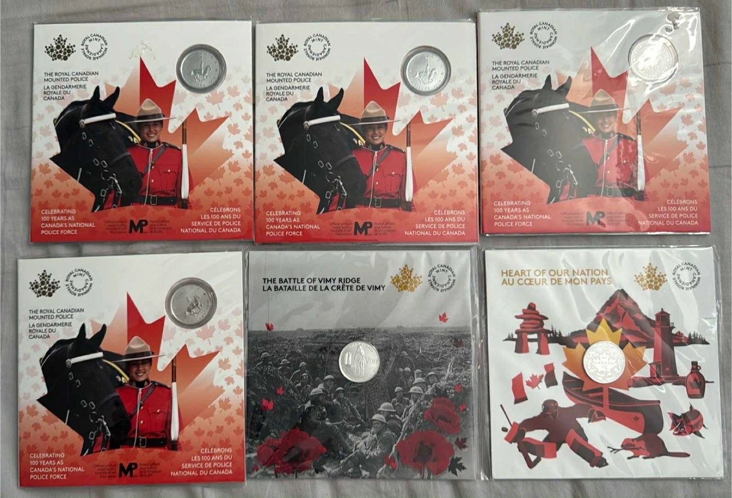 25$ each Selling a collection of Royal Canadian Mint coins, each commemorating significant aspects of Canadian history and identity: - Celebrating 100 Years as Canada's National Police Force (The Royal Canadian Mounted Police) - The Battle of Vimy Ridge / La Bataille de la Crête de Vimy - Heart of Our Nation / Au Coeur de Mon Pays