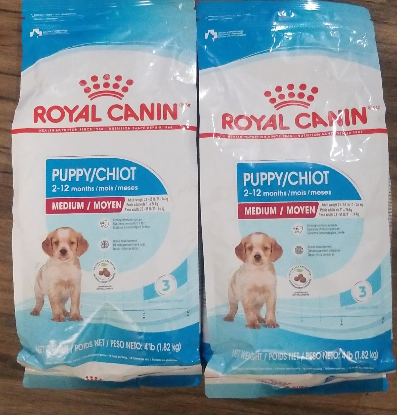 Selling 2 bags of Royal Canin Puppy food for medium breed puppies! It's designed for puppies aged 2-12 months and helps support their immune system and brain development. The net weight is 4 lb (1.82 kg).