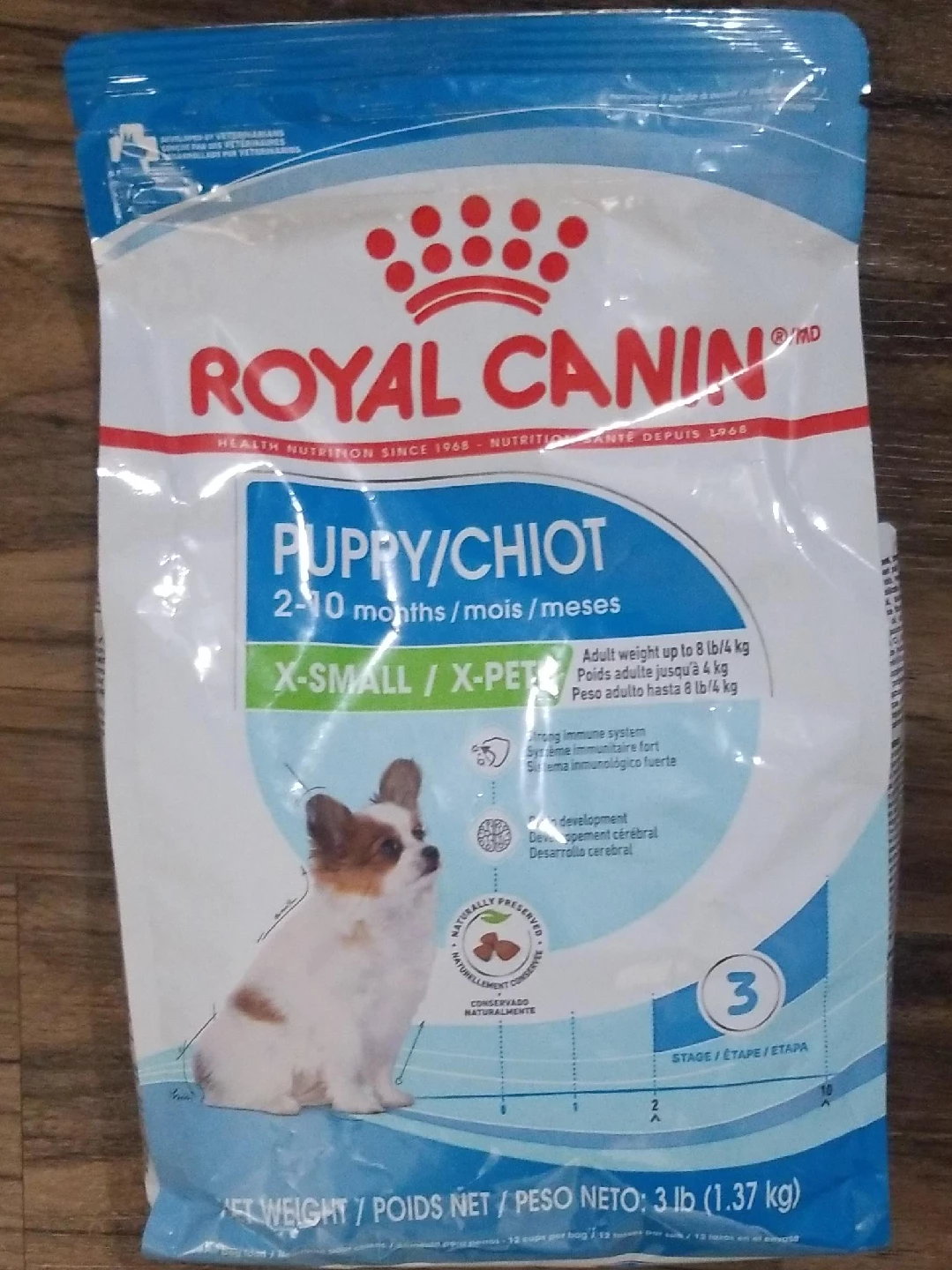 Selling a bag of Royal Canin Puppy food for x-small breeds! It's designed for puppies aged 2-10 months and is formulated to support a strong immune system and brain development. The bag contains 3 lb (1.37 kg) of food.