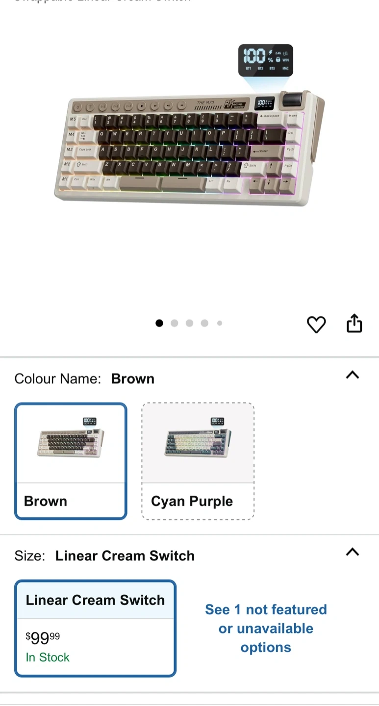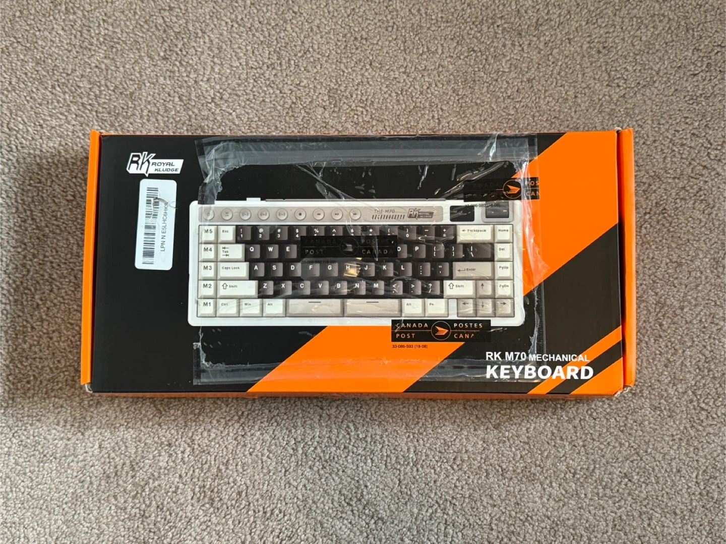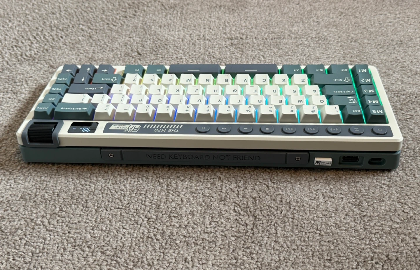 Selling a Royal Kludge RK M70 mechanical keyboard. It's in great shape and ready for a new home! The keyboard features a unique design with a mix of grey, white, and blue-grey keycaps, and RGB backlighting for a cool aesthetic. It also has a variety of function keys and a compact layout.