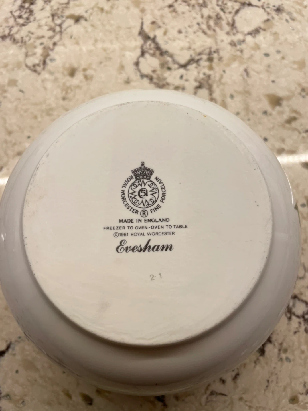 Selling a Royal Worcester Evesham bowl. It's in great condition and features lovely fruit designs around the outside. The bowl is freezer to oven to table safe, and is made in England. Perfect for adding a touch of elegance to your kitchen or dining room! See photos for specifications! Pick up from Northwest Oakville (Closest major intersection Brontë Road and Dundas Street)