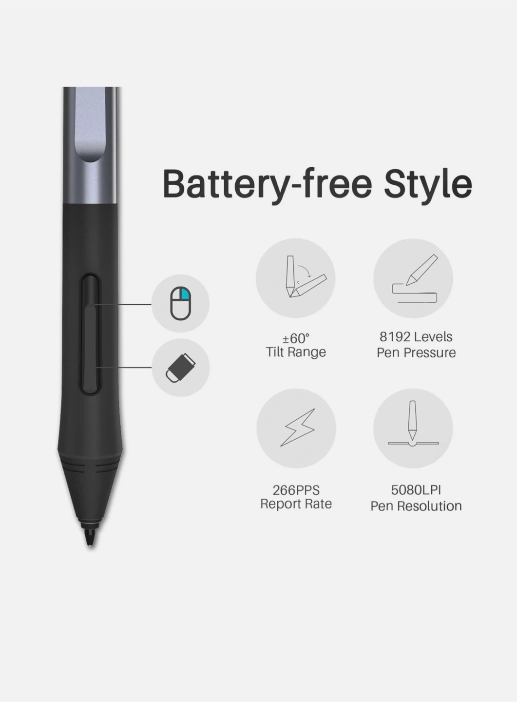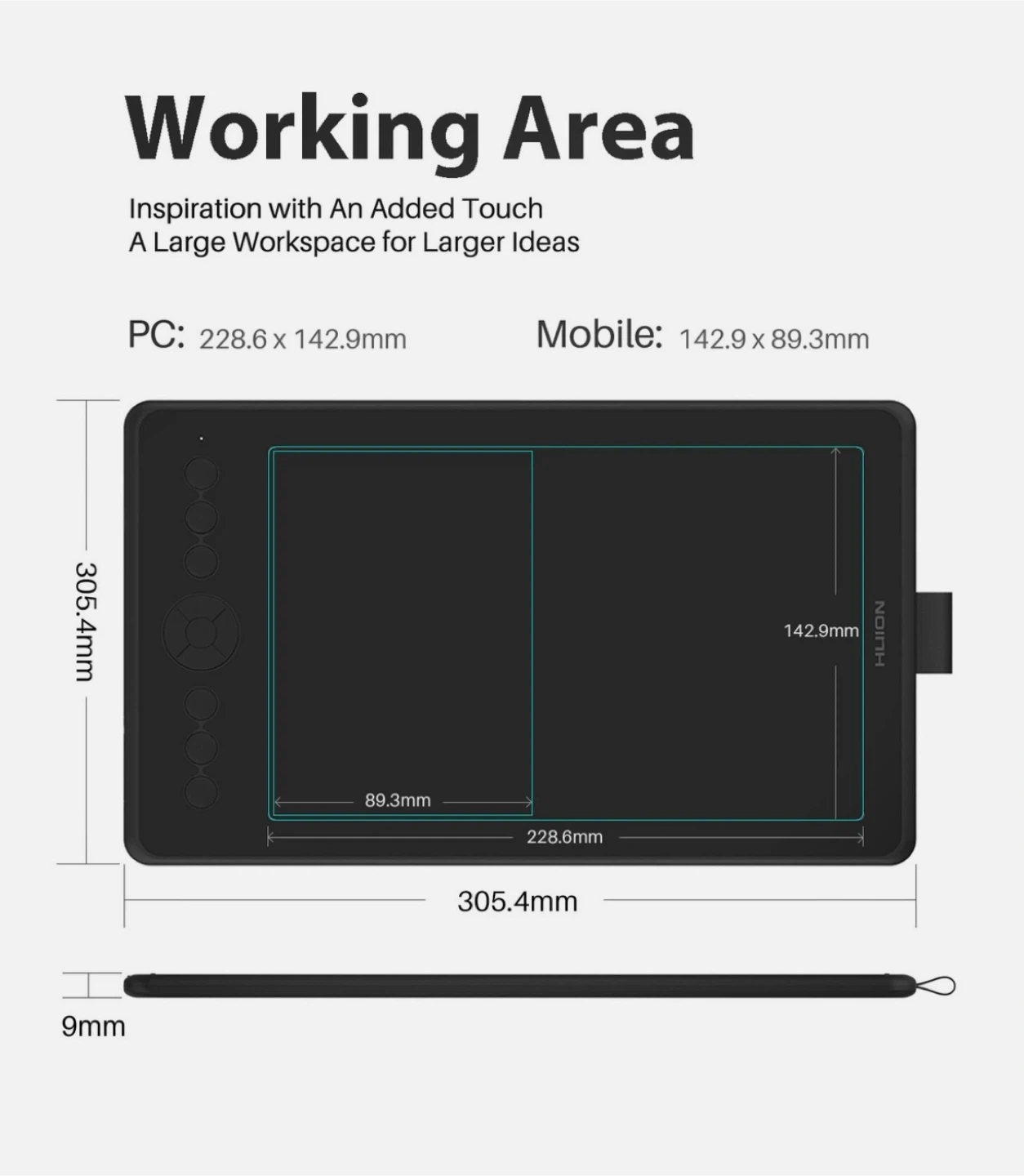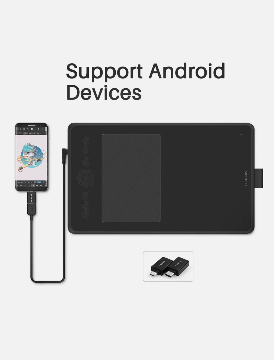 This HUION INK H320M is a graphics drawing tablet and an LCD writing tablet. It comes with a battery-free pen with 8192 levels of pen pressure and a tilt range. The tablet supports Android devices and has a working area of 228.6 x 142.9mm for PCs. It also features a Type-C connection.
