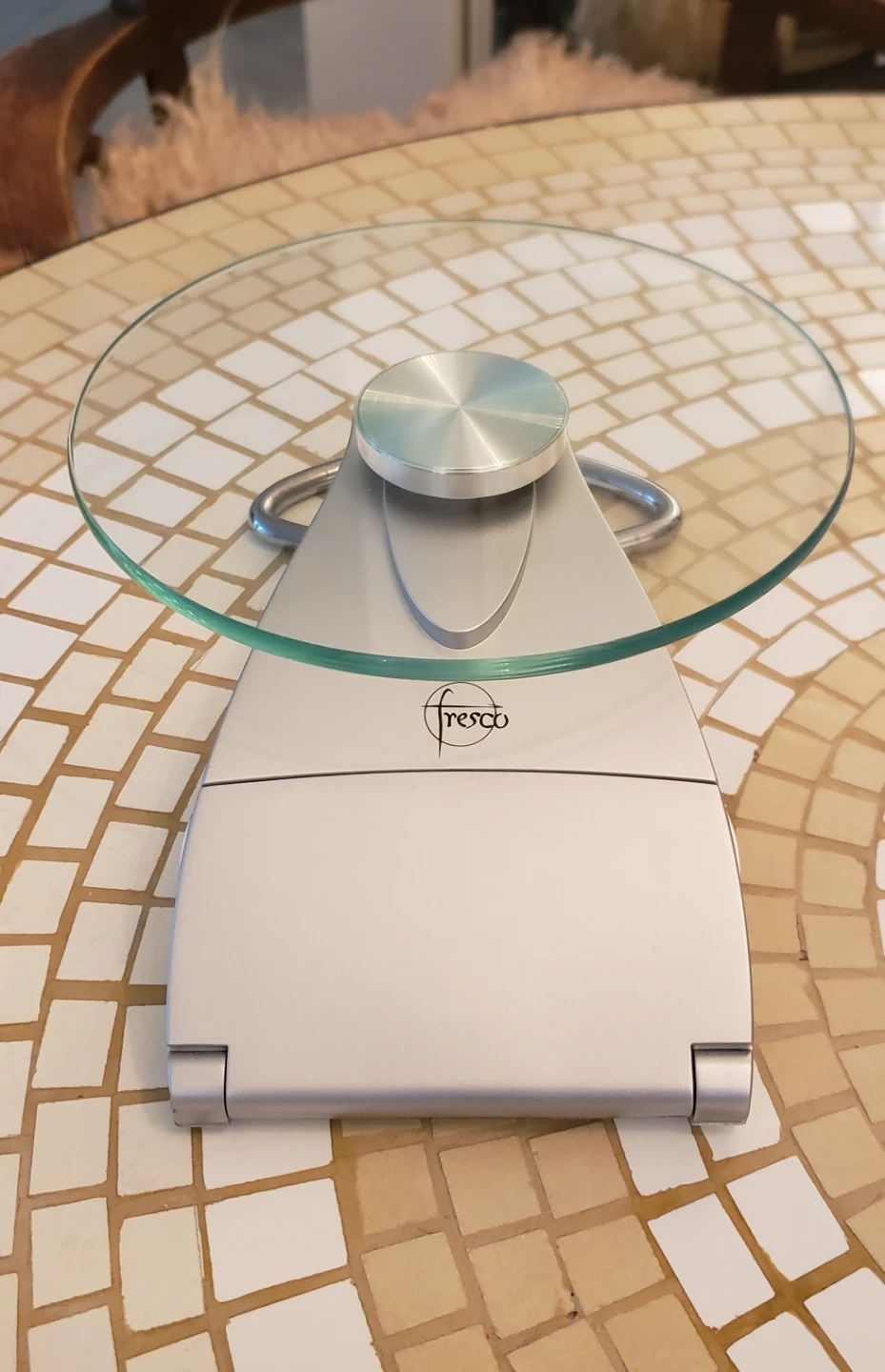 This Fresco electronic nutrition scale features a glass weighing platform and a digital display. It's great for precise ingredient measurements.
