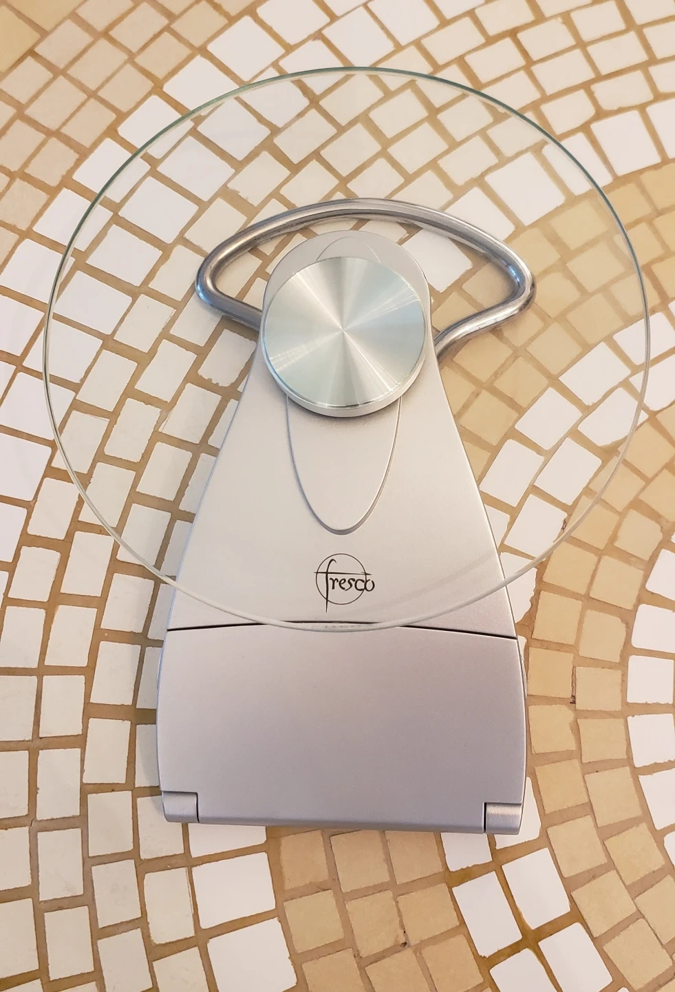 This Fresco electronic nutrition scale features a glass weighing platform and a digital display. It's great for precise ingredient measurements.