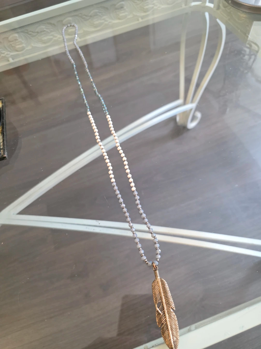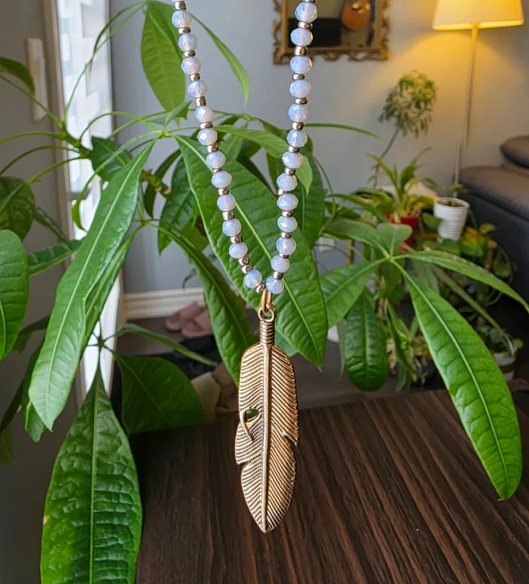 Beautiful long necklace featuring white, grey, and blue faceted beads. It's accented with a large, antique-look gold feather pendant. This necklace adds a touch of boho style to any outfit!