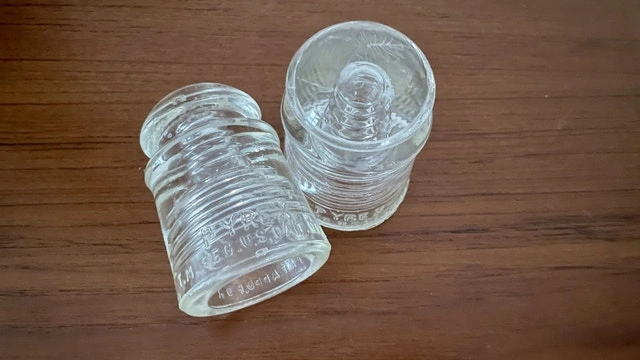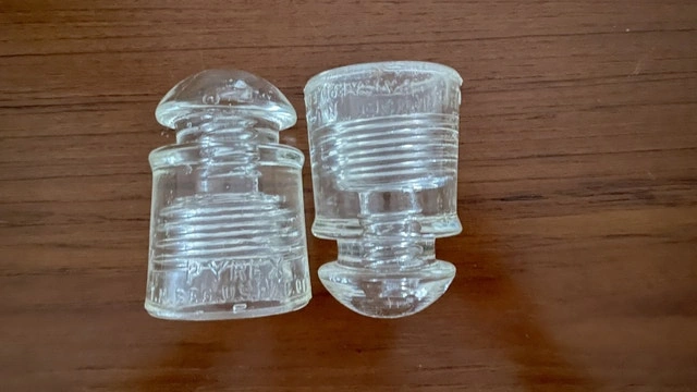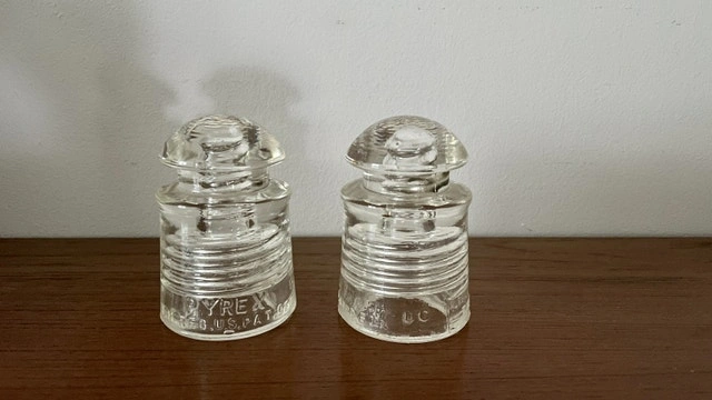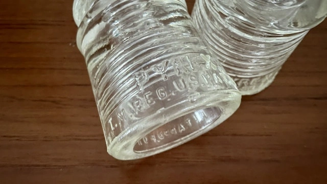 An antique clear glass insulator made by Pyrex - U.S.A. In great condition. Embossed around the sides: Pyrex T.M. Reg. U.S. PAT. OFF Made in U.S.A. Pat. Appd. For J Y. Height: 4 inches. Width at the base: 2 5/8 inches. Weight: 447 grams. The great majority of glass Pyrex insulators for the U.S. market were made between about 1922 and 1951. Vintage Glass insulators were first produced in the 1850s for telegraph lines, then for telephone and power transmission lines. They insulated and protected the wooden poles from the electricity coursing through the wires.