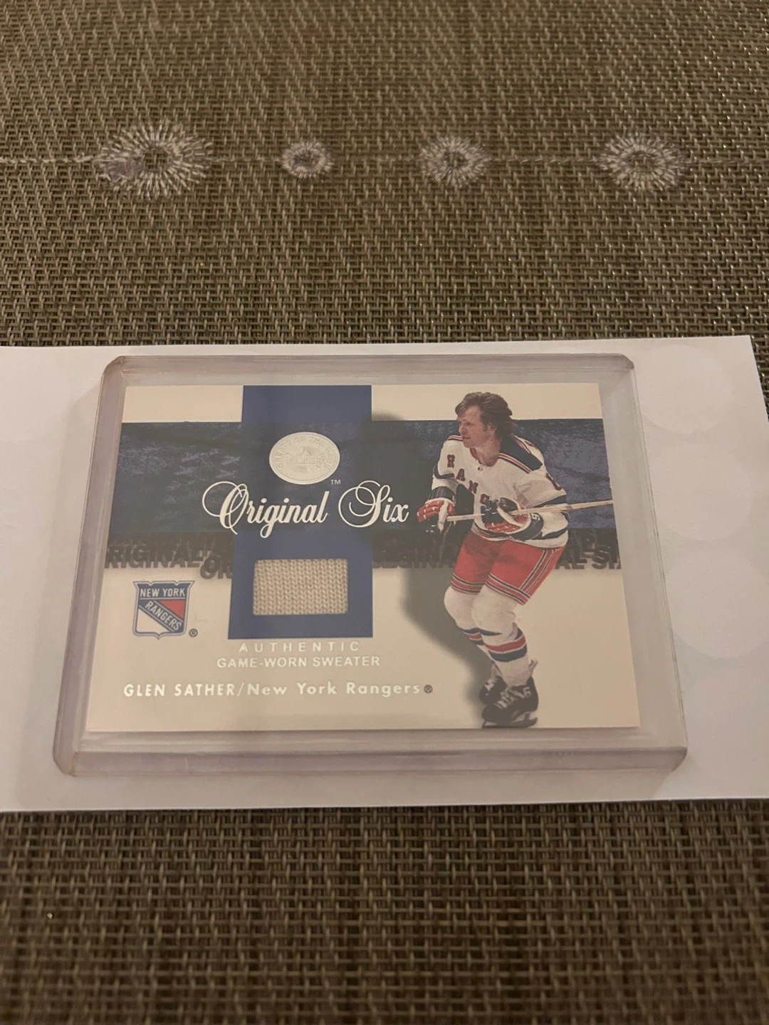 This is an Original Six trading card featuring Glen Sather and a piece of his authentic game-worn sweater from the New York Rangers.
