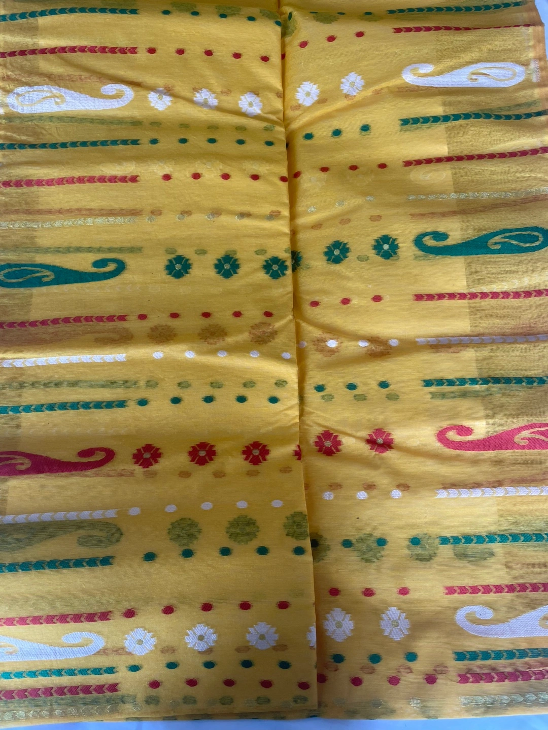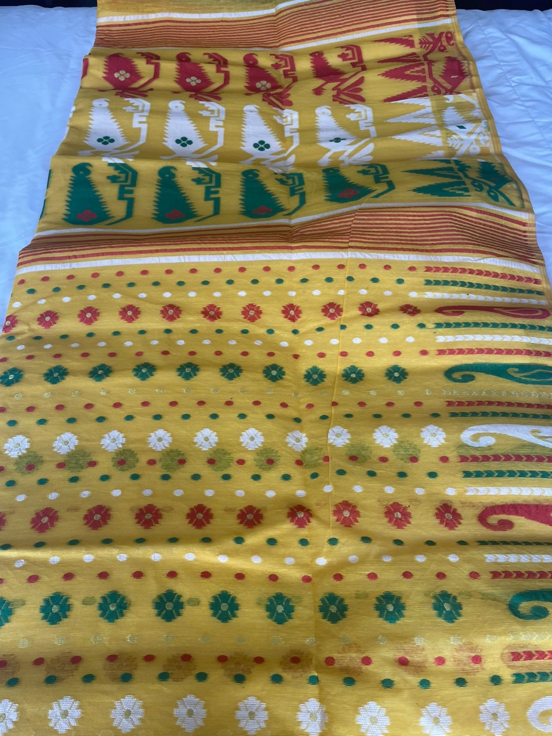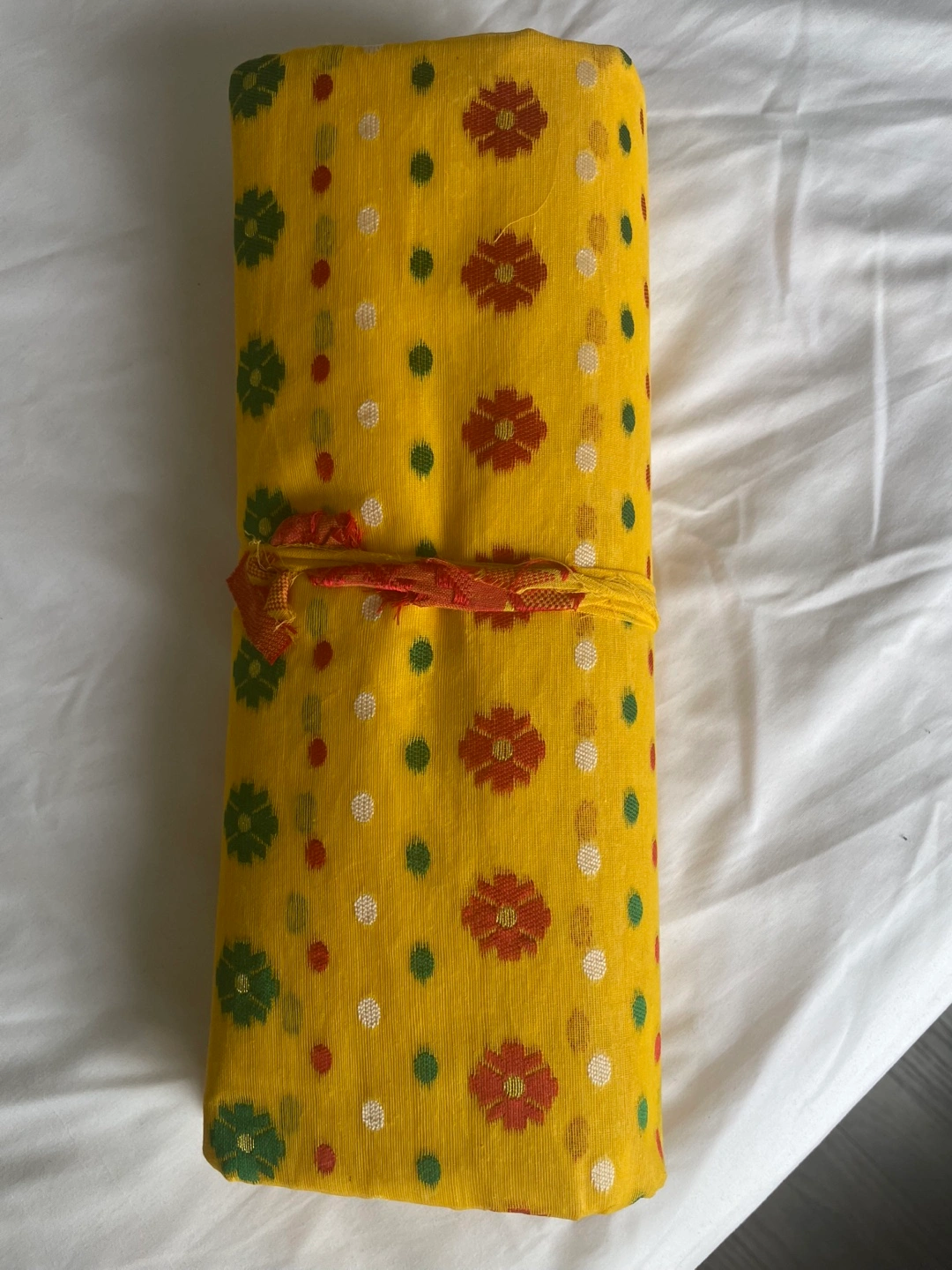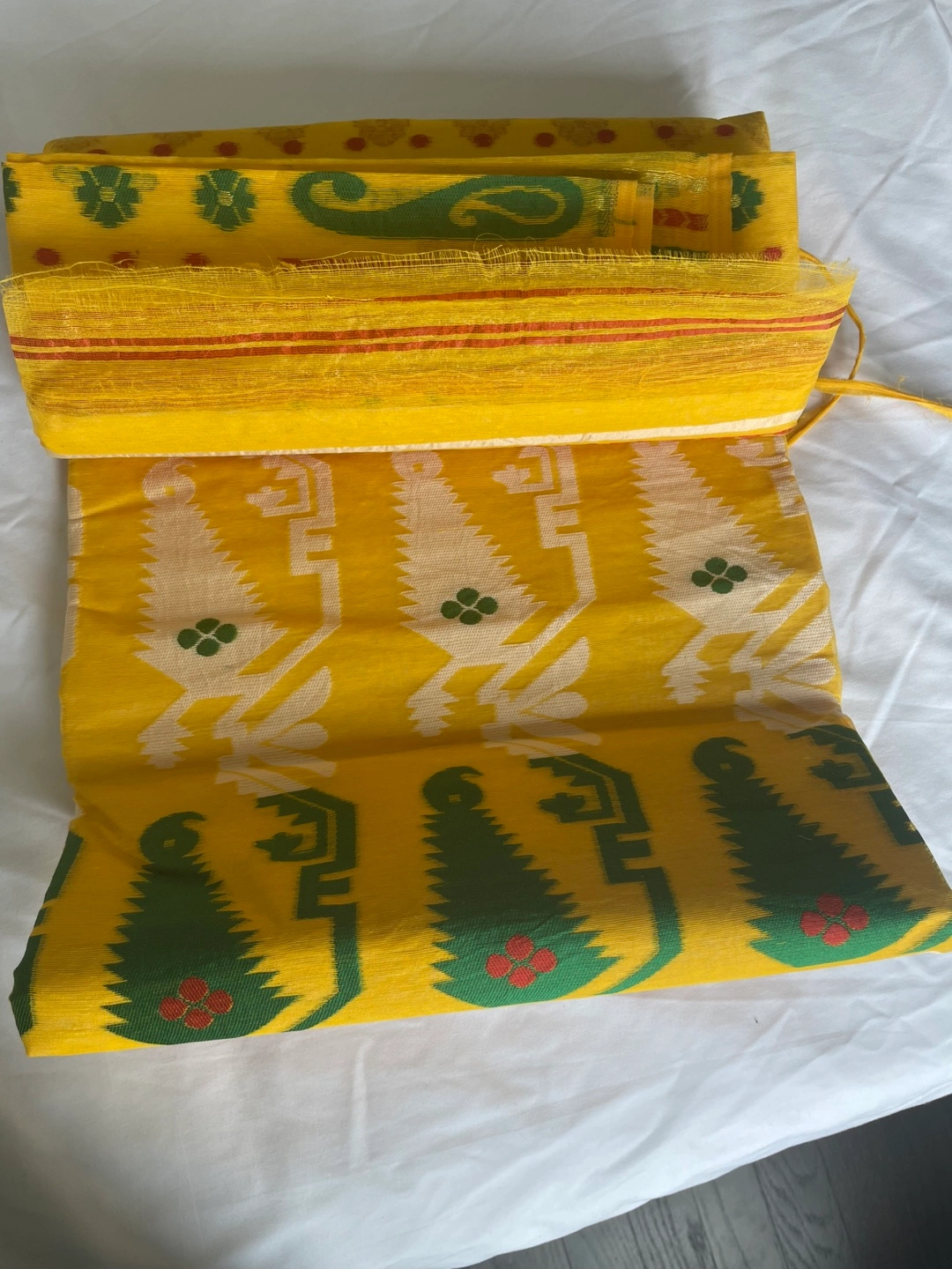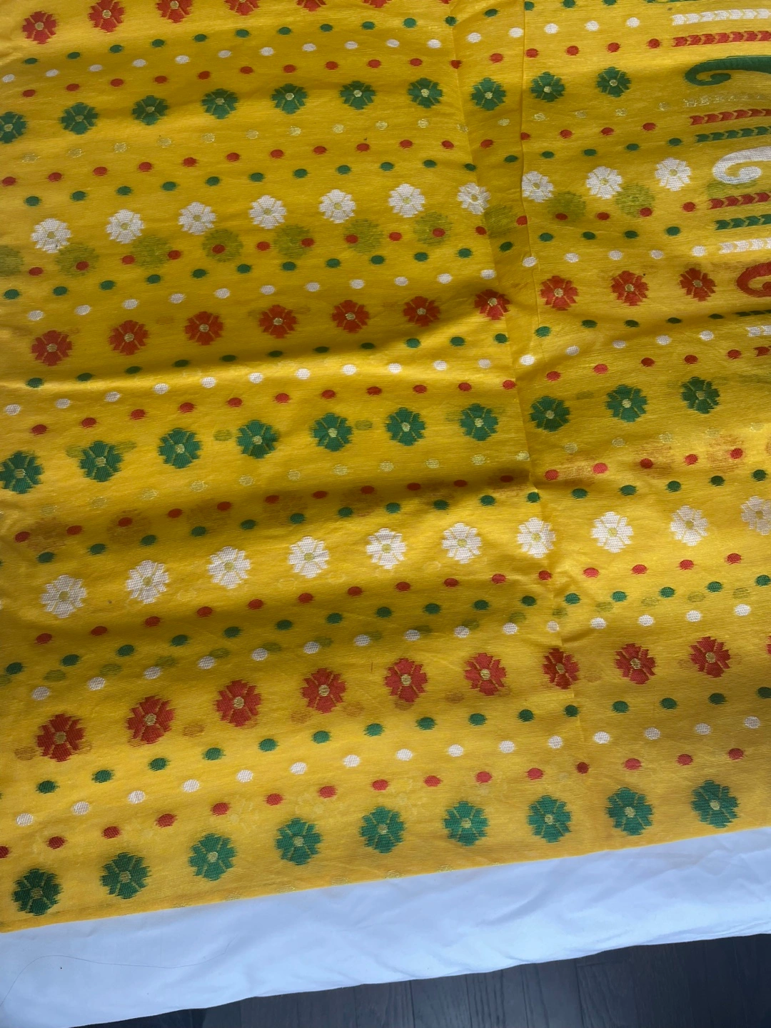 Gorgeous yellow saree. Features intricate patterns and vibrant colours. Soft and luxurious fabric. Perfect for special occasions. Slight imperfections may be present.
