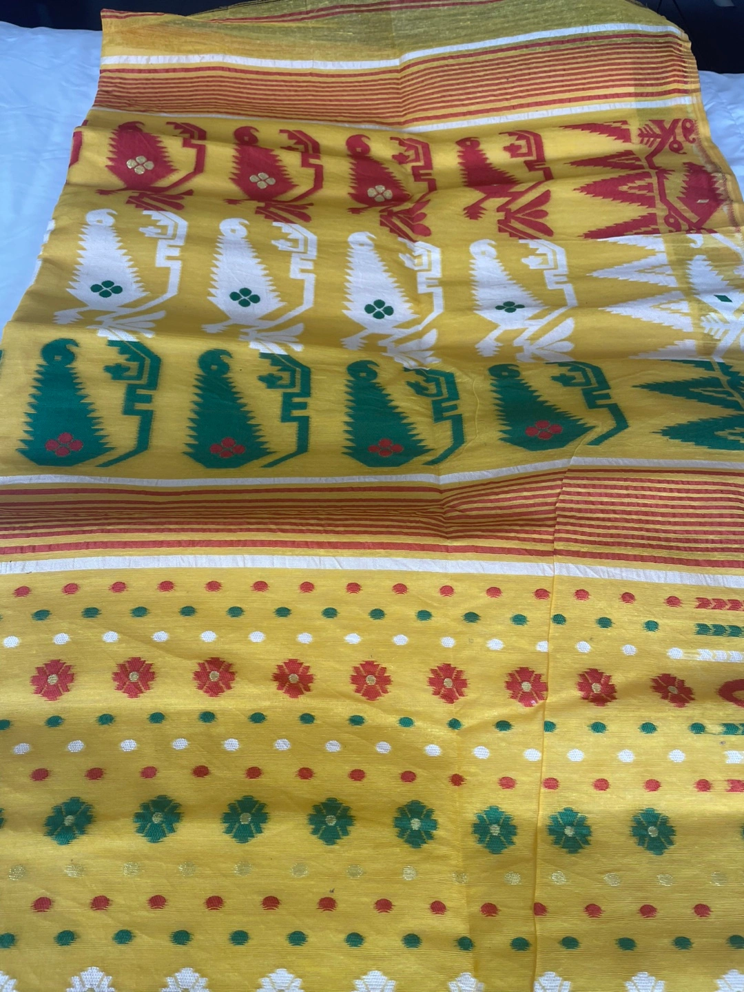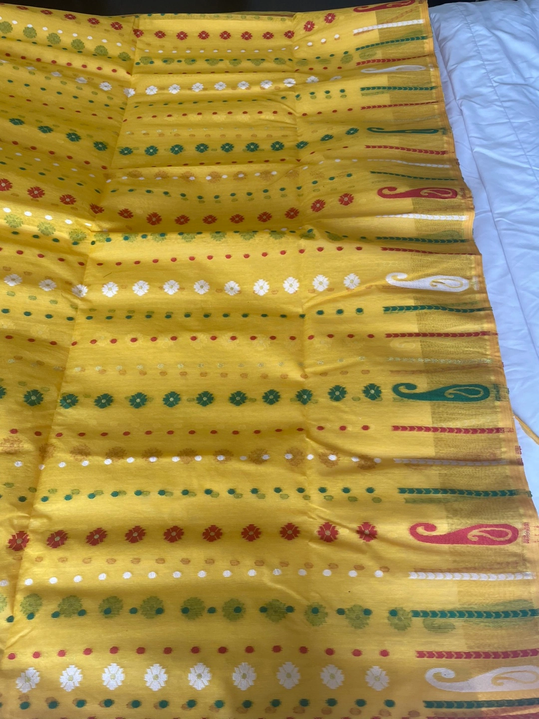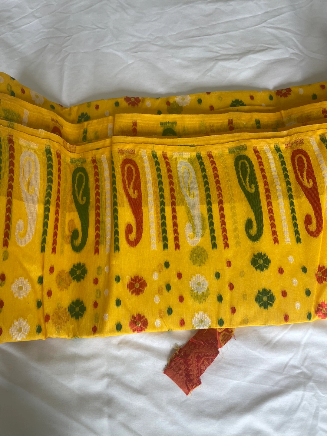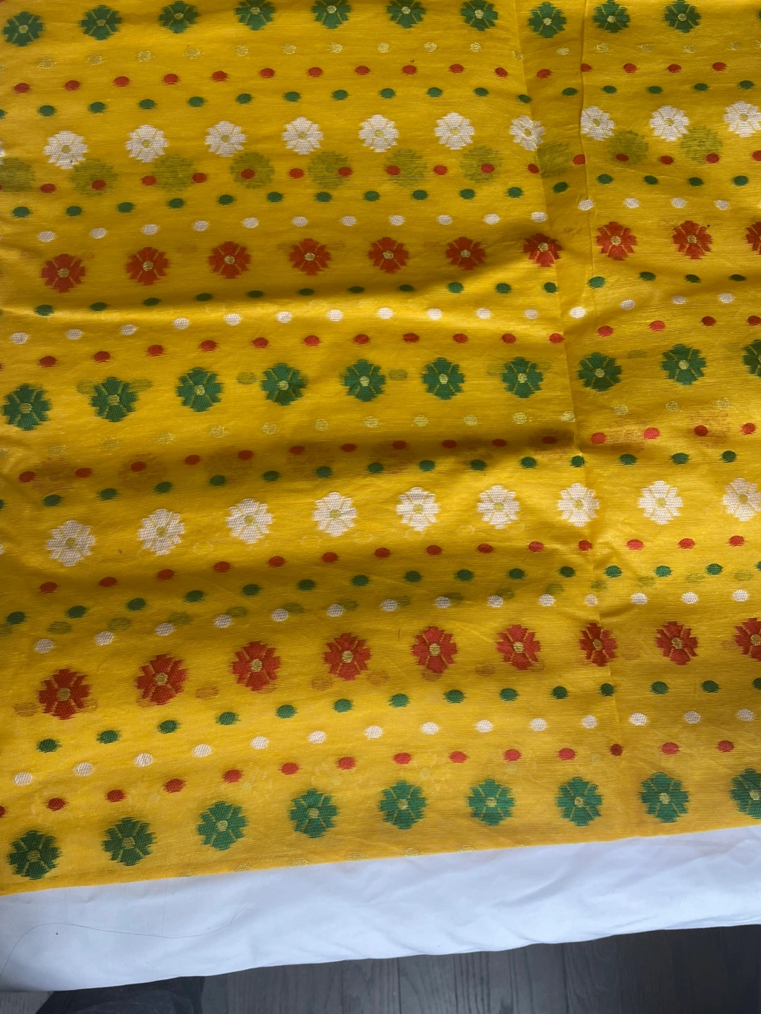 Gorgeous yellow saree. Features intricate patterns and vibrant colours. Soft and luxurious fabric. Perfect for special occasions. Slight imperfections may be present.