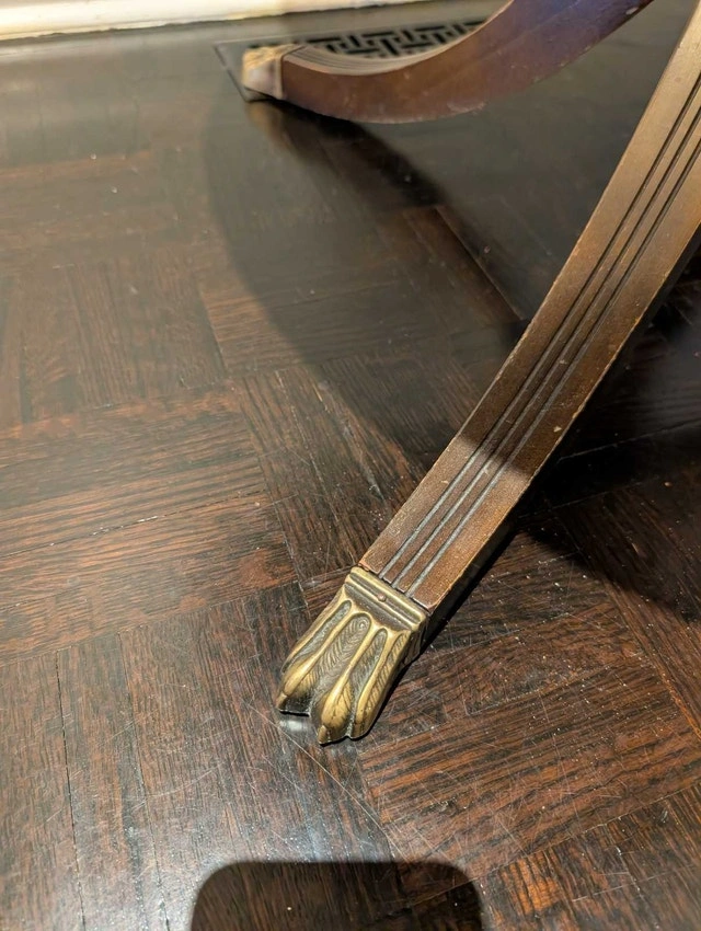 This is a round side table, perfect for adding a touch of elegance to any room. The table features a drawer and stands on clawed feet. It's in good condition and ready for a new home. Looking for a spot to perch your Earl Grey or perhaps a stylish stand for your prized gnome collection? This table is ready to serve! (Please note: Gnomes and tea not included.) If the ad is up, it's available! Cash accepted.