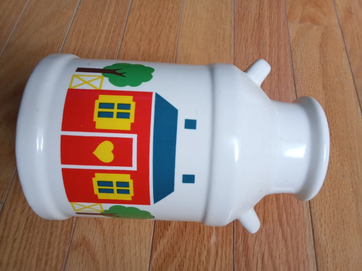 This charming white ceramic milk jug features a delightful farmhouse and tree decal. It's a cute decorative piece for your kitchen. This jug is 7 inches tall