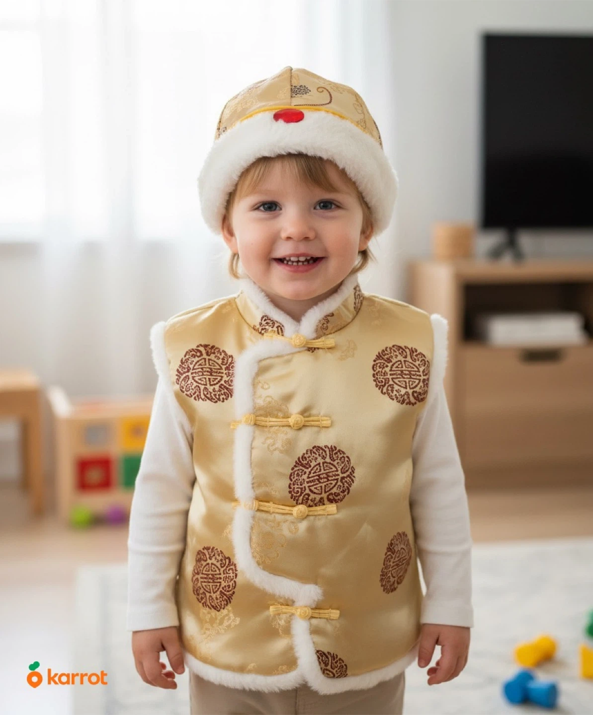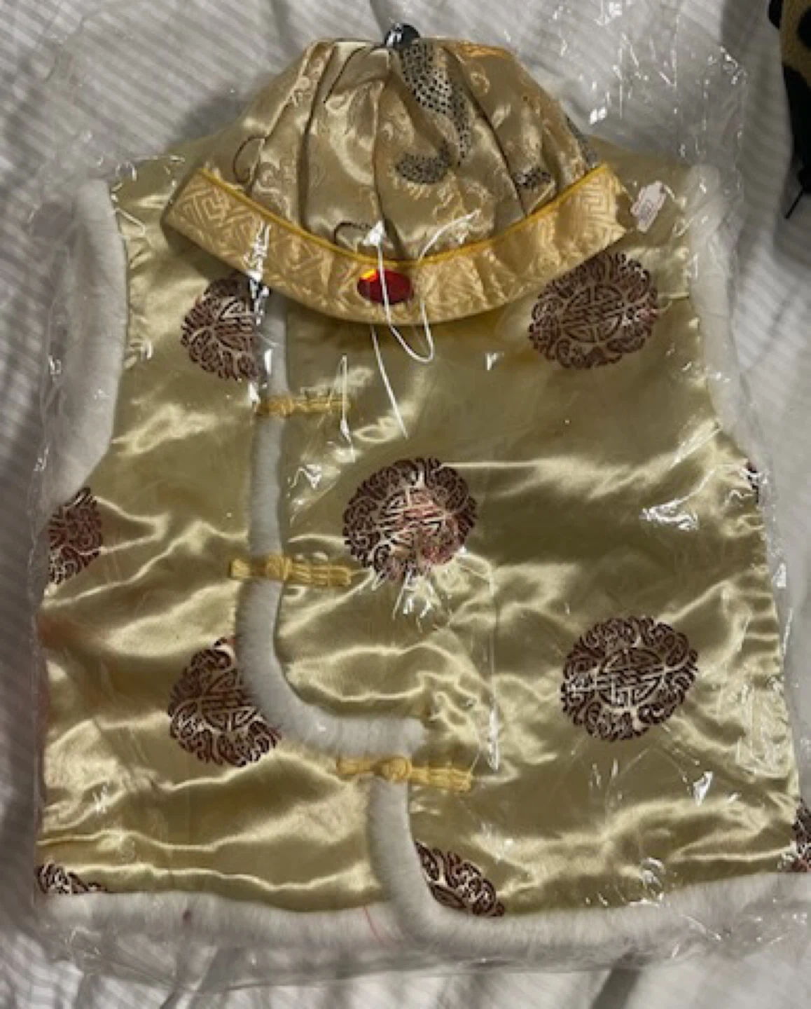 A traditional Chinese-style vest and hat set for kids. It's size XXL and features a gold satin material with white faux fur trim. The set includes a matching hat. This outfit is great for cultural events or dress-up play!