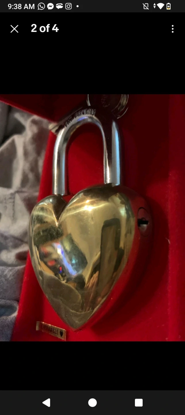 This is a vintage 80's brass heart-shaped padlock. It comes in its original red box and includes two keys. The padlock features a polished brass finish. It's a decorative piece with a classic design.