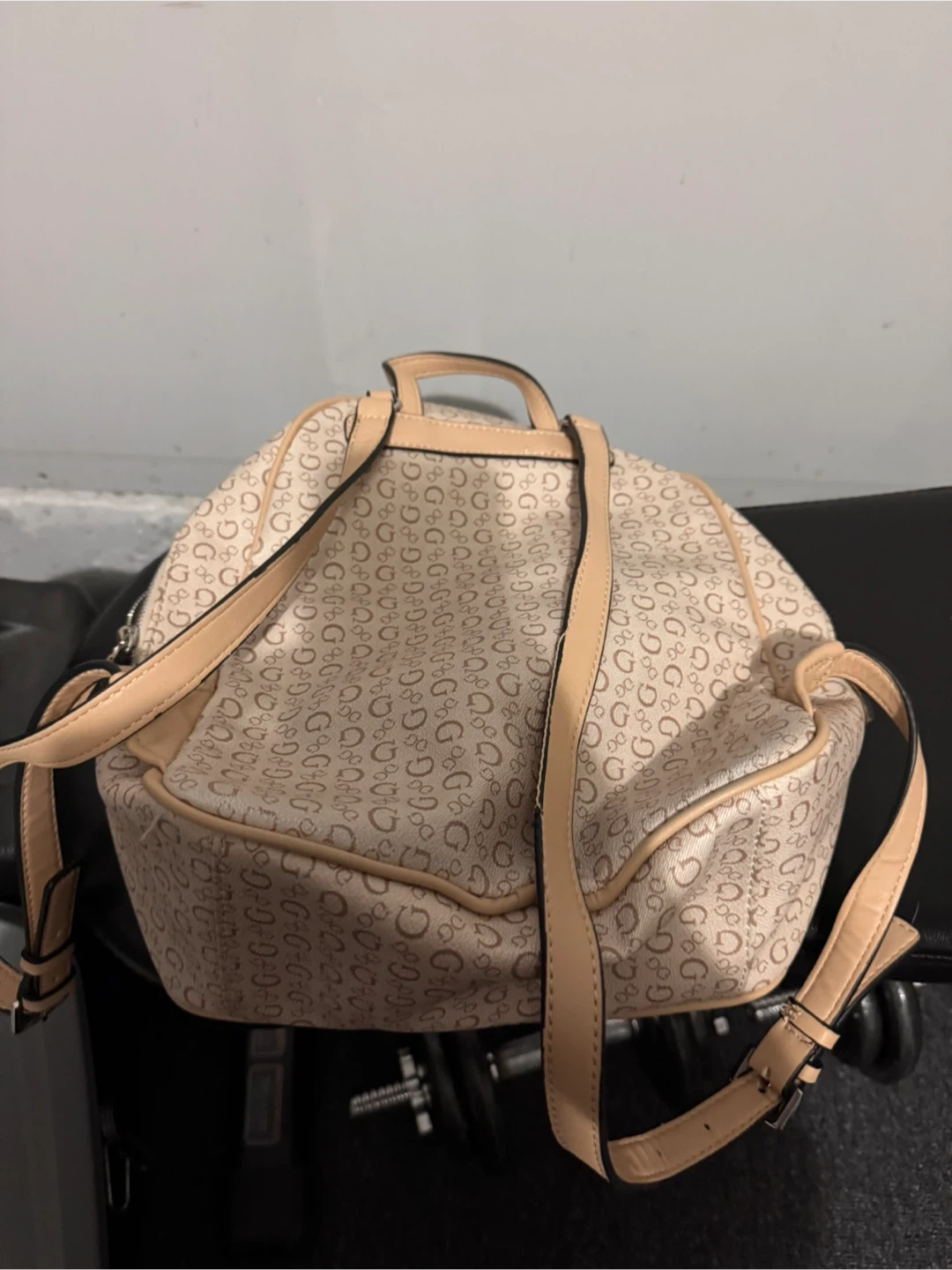 This is a Guess backpack with a repeating 'G' logo pattern in a light beige colour. It has a front pocket and adjustable straps. It's perfect for everyday use or as a stylish accessory!
