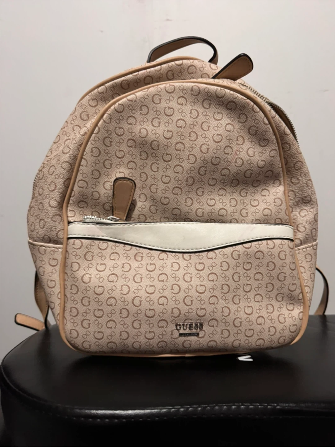 This is a Guess backpack with a repeating 'G' logo pattern in a light beige colour. It has a front pocket and adjustable straps. It's perfect for everyday use or as a stylish accessory!