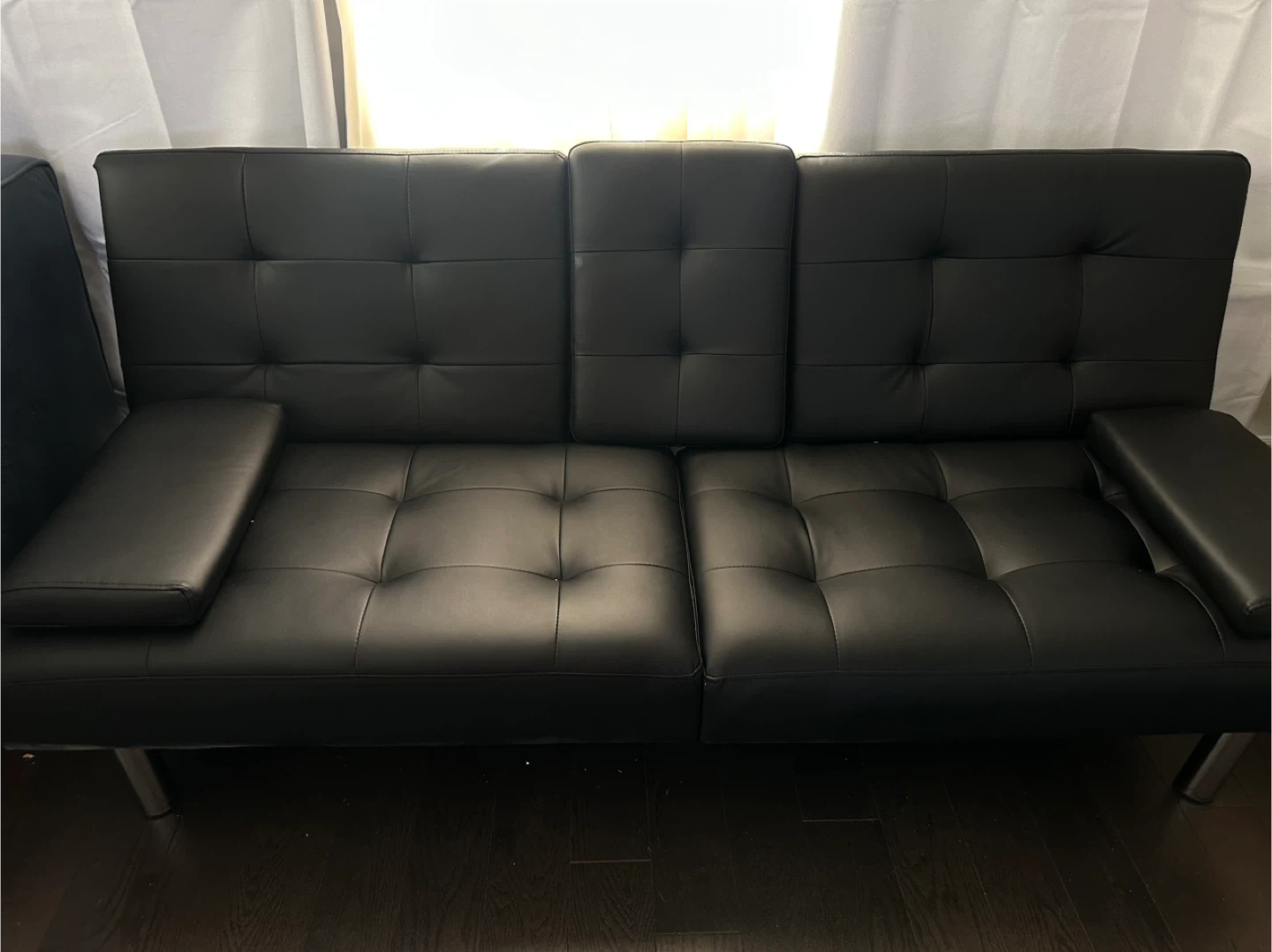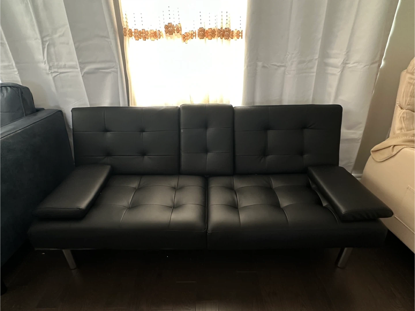 This black faux leather loveseat sofa bed offers a sleek and modern design. It features button tufting on the seat and back cushions for added detail. The sofa converts into a flat sleeping surface, making it a functional piece for small spaces. This item is a great solution for overnight guests or everyday use.