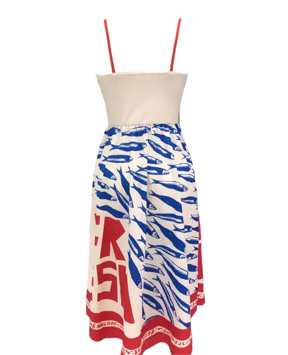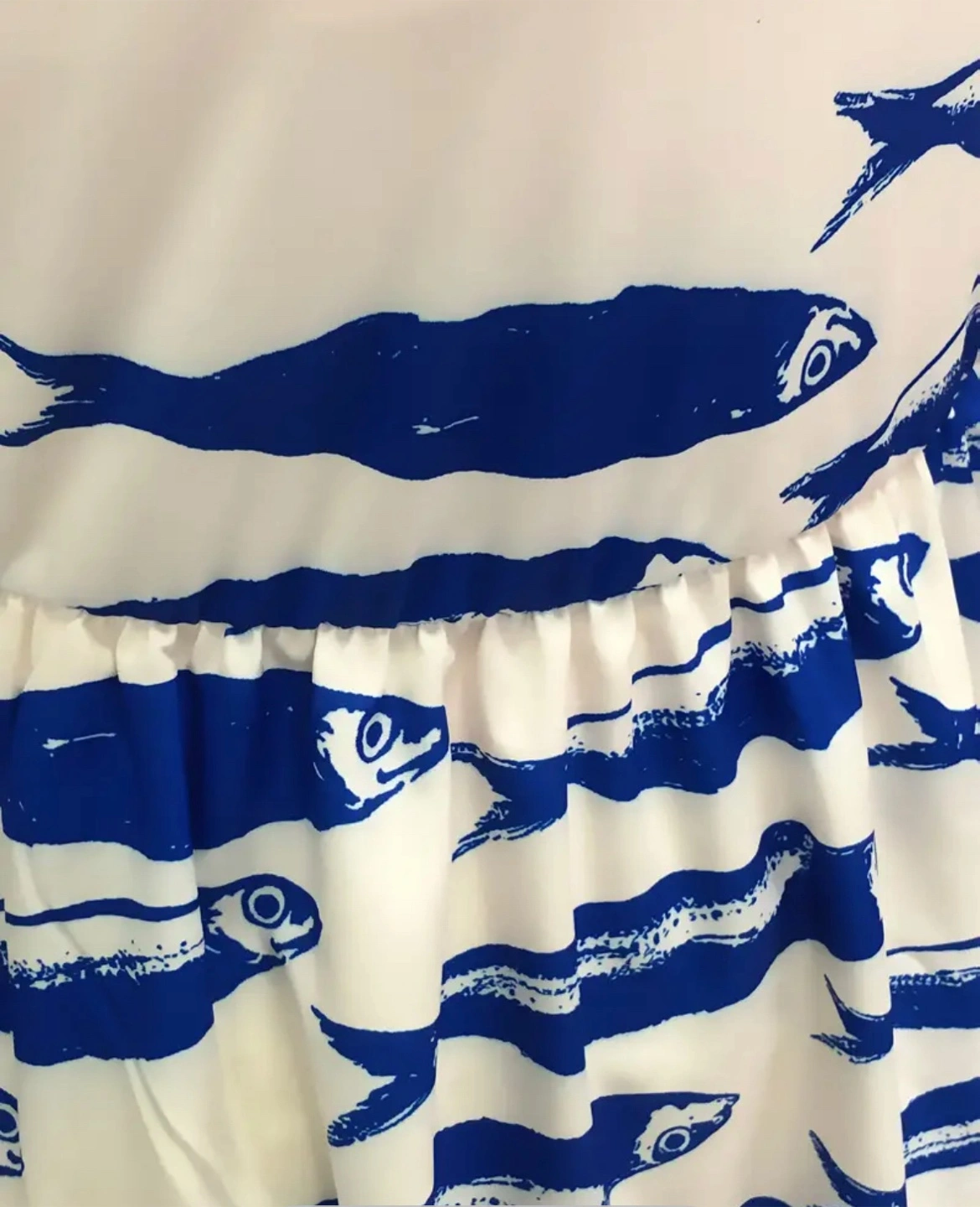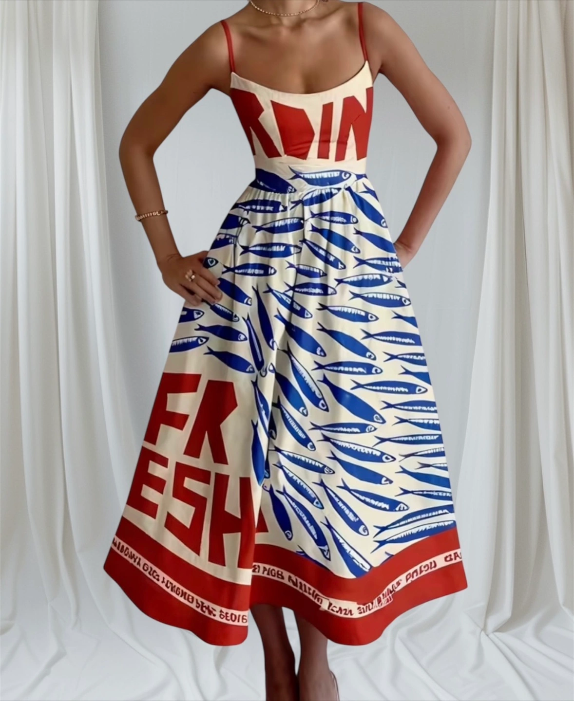 This dress features a fun and unique fish print design! The size is L. Measurements in photo. Perfect for adding a pop of colour and whimsy to your wardrobe!