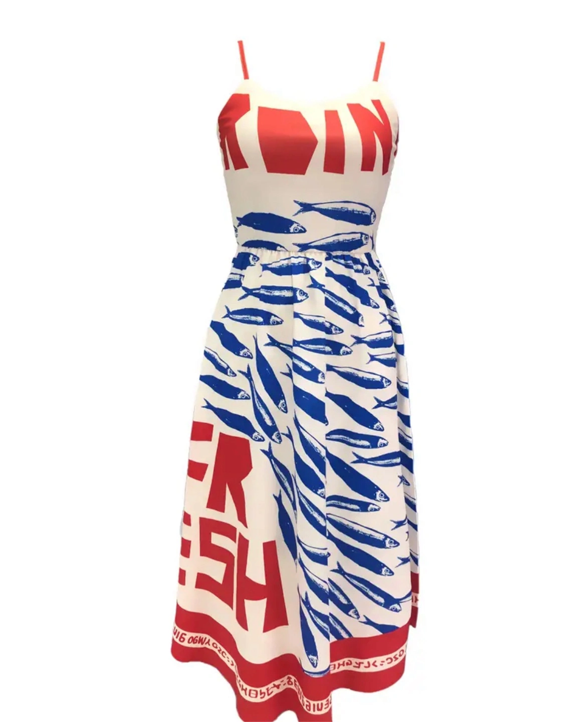 This dress features a fun and unique fish print design! The size is L. Measurements in photo. Perfect for adding a pop of colour and whimsy to your wardrobe!