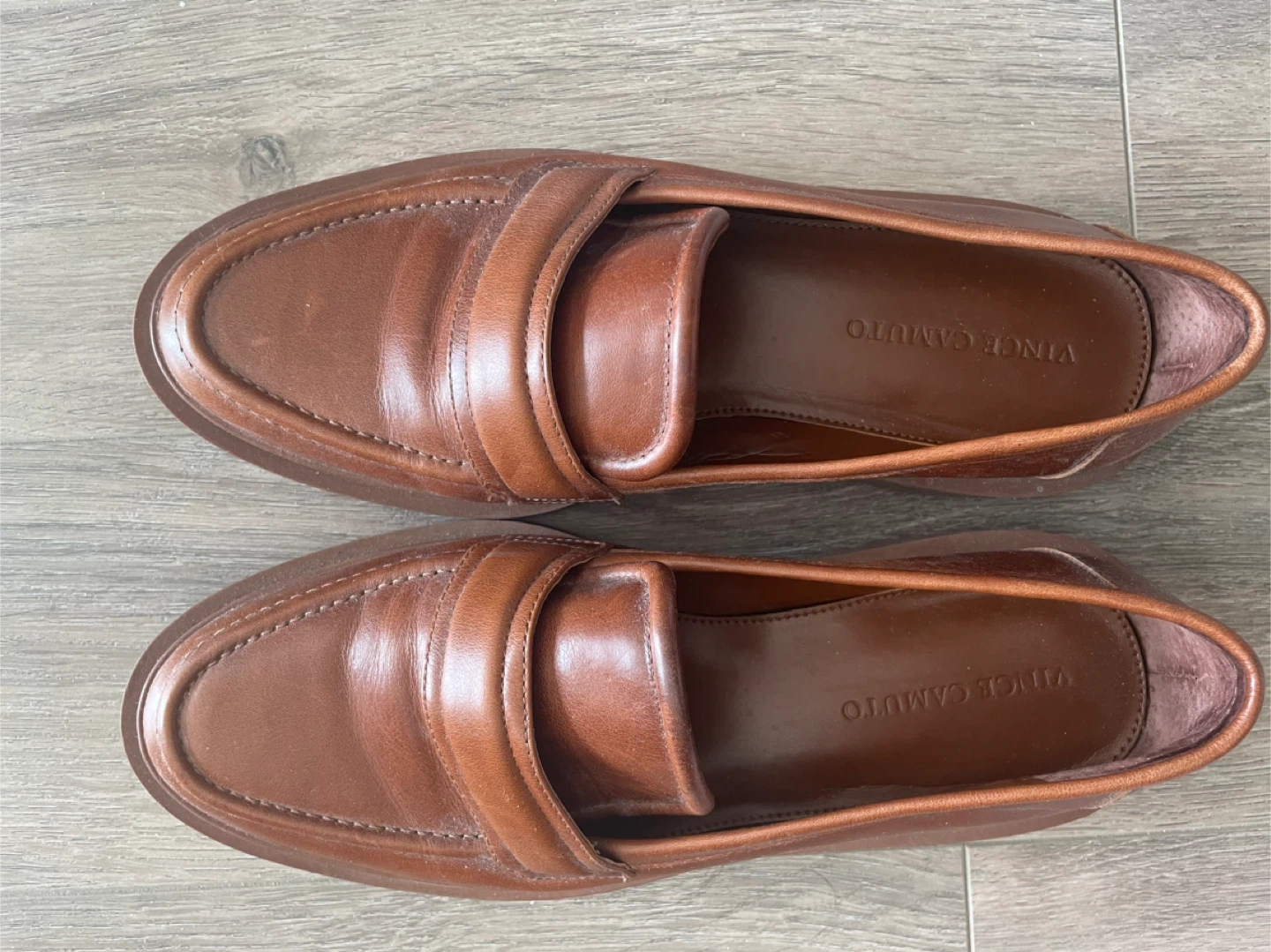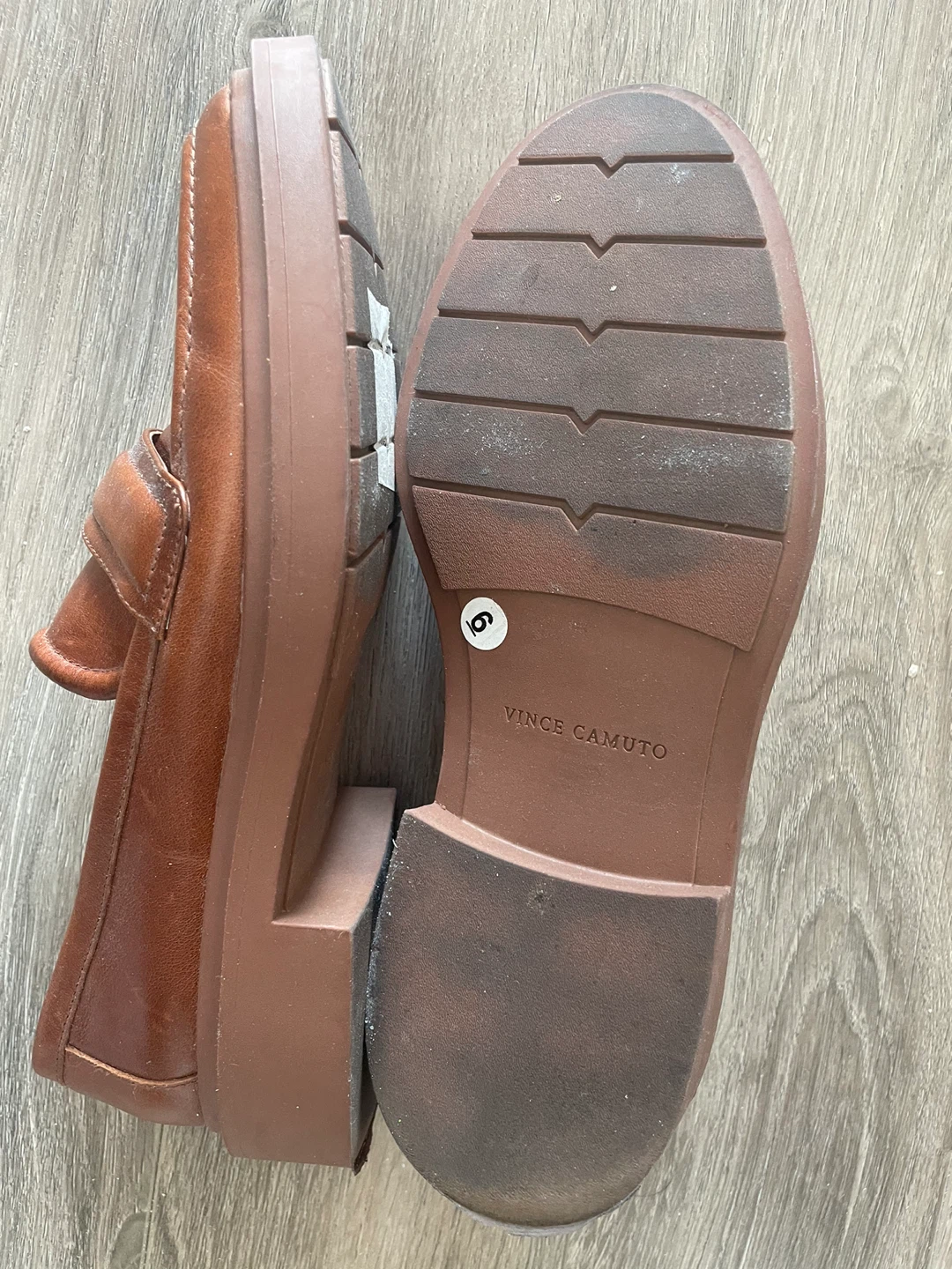 These are Vince Camuto brown leather loafers. Size is 6. Leather material.