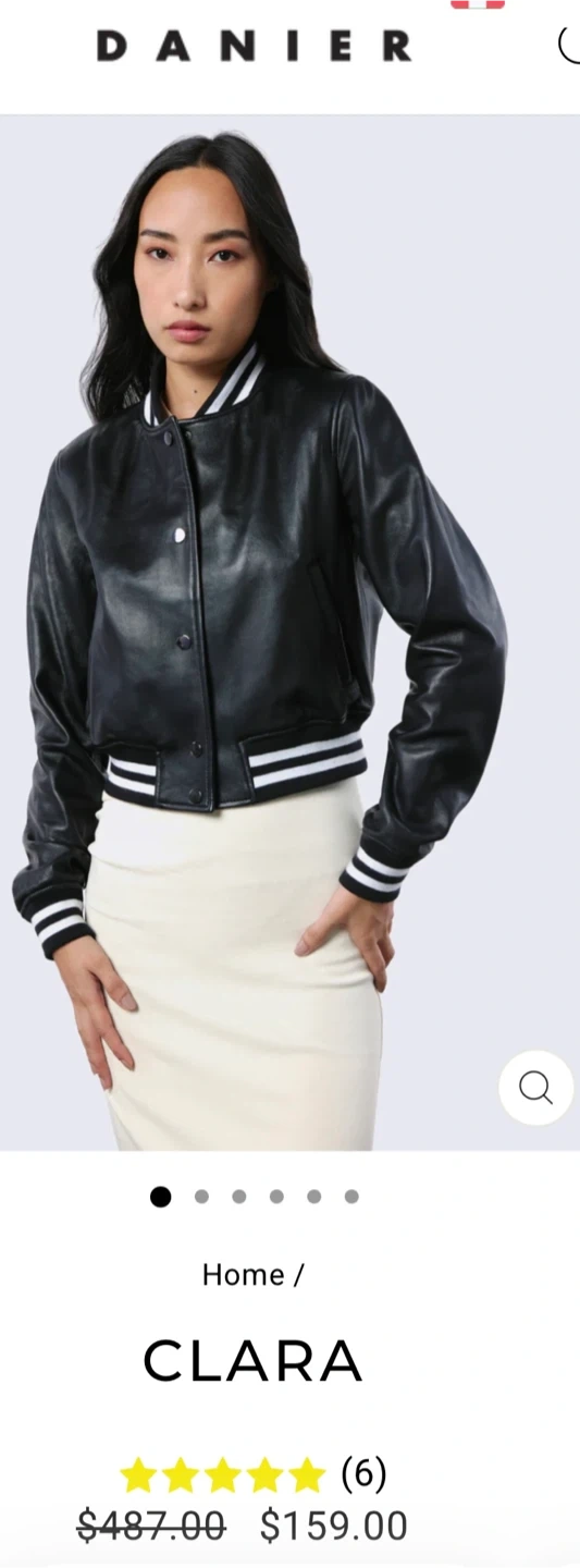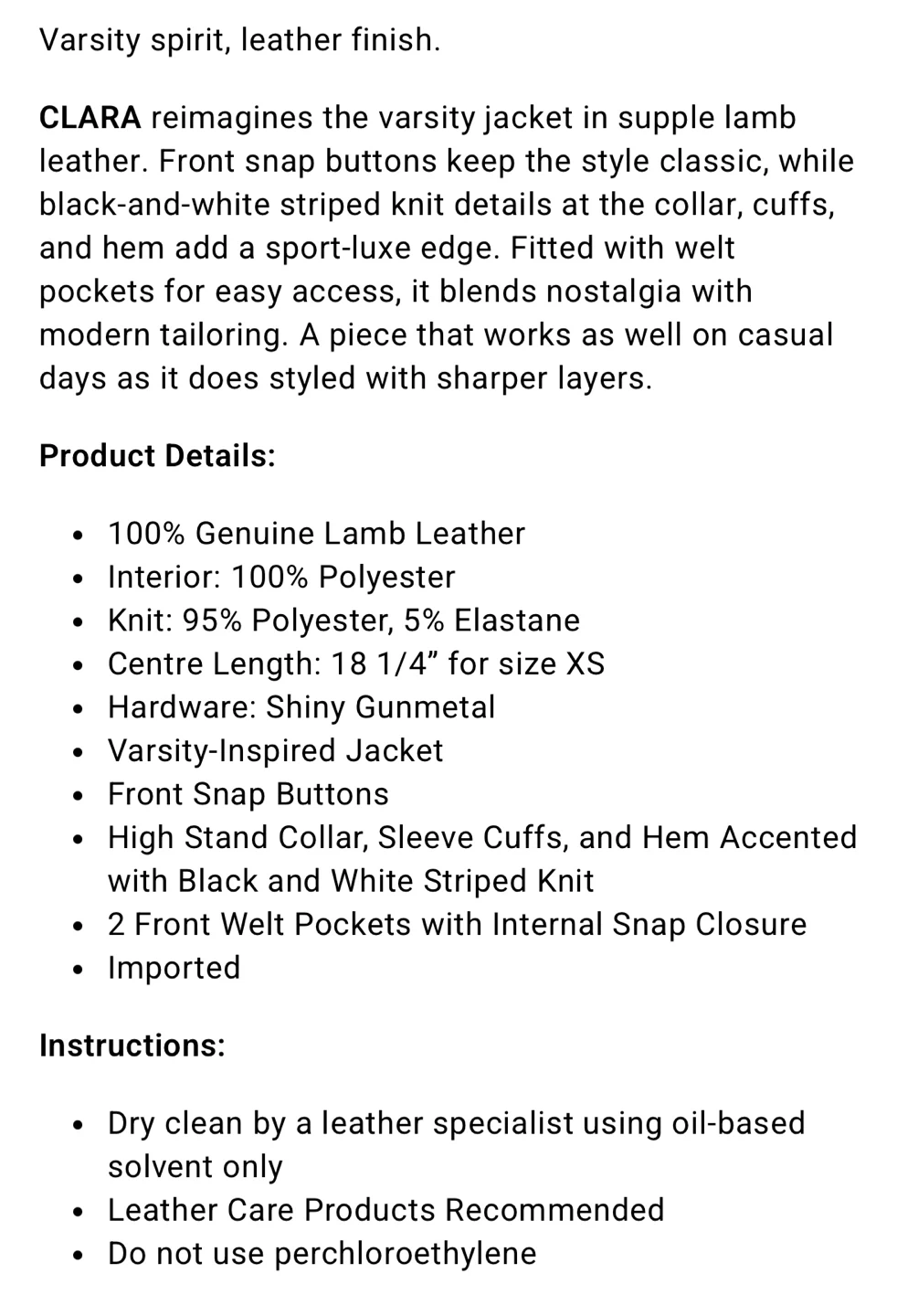 CLARA reimagines the varsity jacket in supple lamb leather. Front snap buttons keep the style classic, while black-and-white striped knit details at the collar, cufts, and hem add a sport-luxe edge. Fitted with welt pockets for easy access, it blends nostalgia with modern tailoring. A piece that works as well on casual days as it does styled with sharper layers.