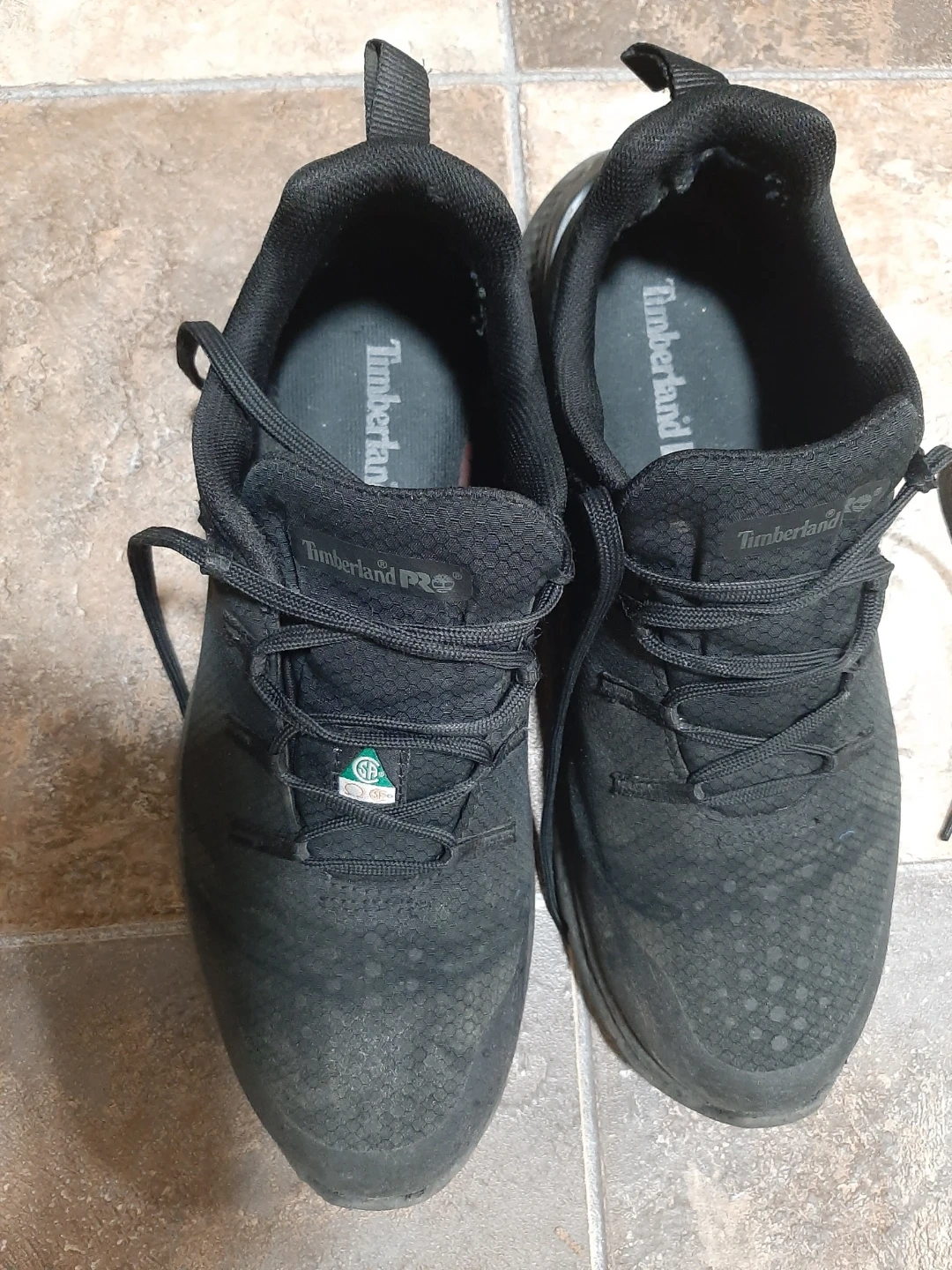 Timberland Pro safety shoes in black. These shoes offer protection and comfort for work environments. They're designed for durability on the job site.