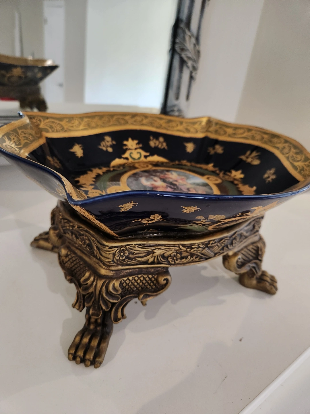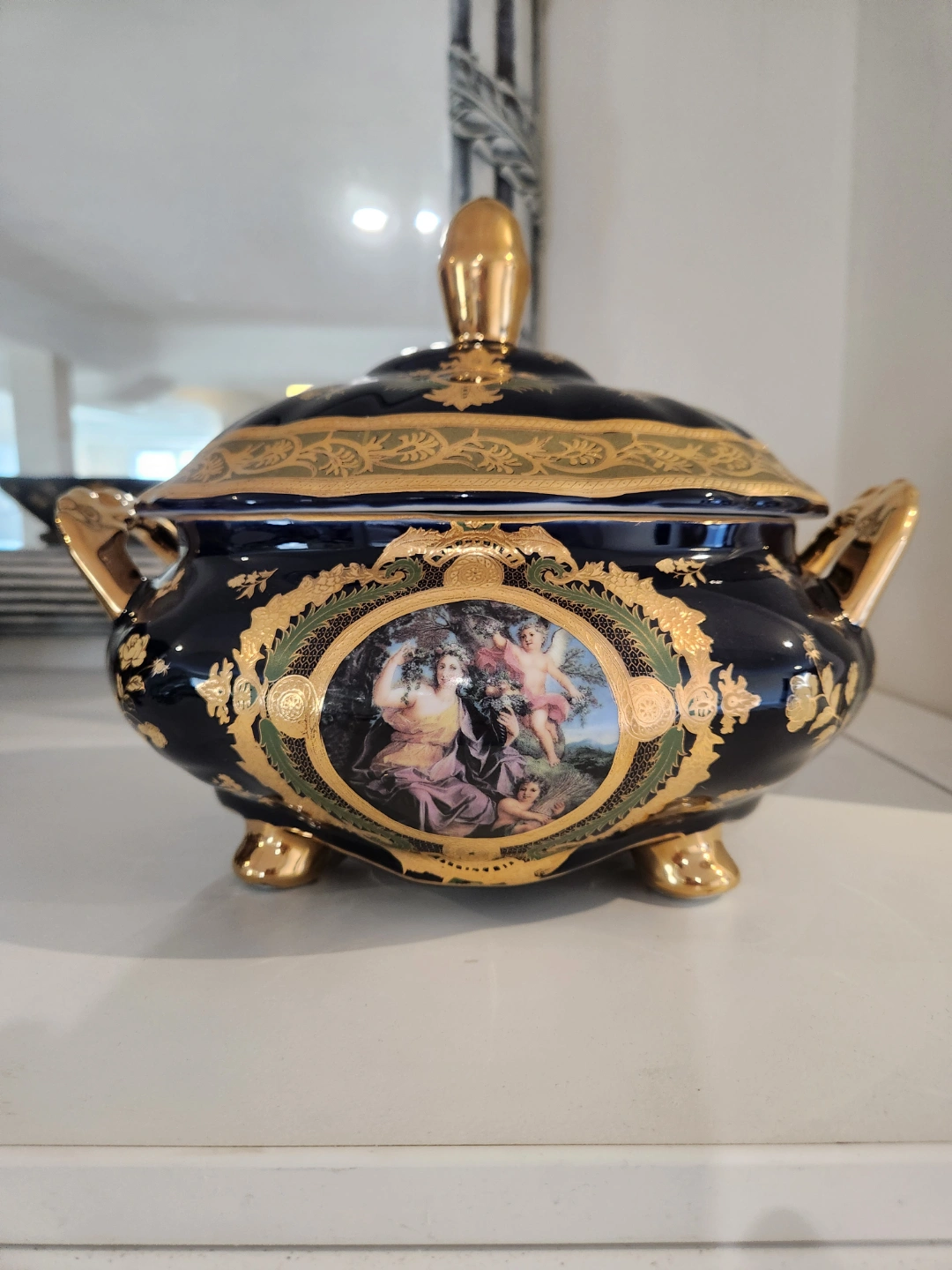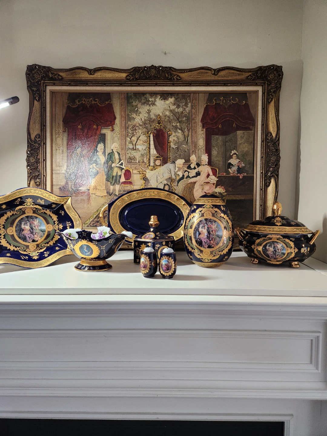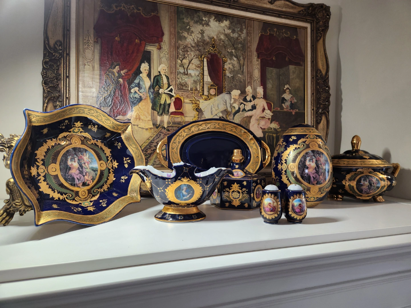 Elegant, cobalt blue and 24k gold porcelain dinnerware set. Features ornate gold detailing and painted scenes. Includes serving dishes, bowls, salt and pepper shakers. Perfect for collectors or adding a touch of vintage elegance to your home. available