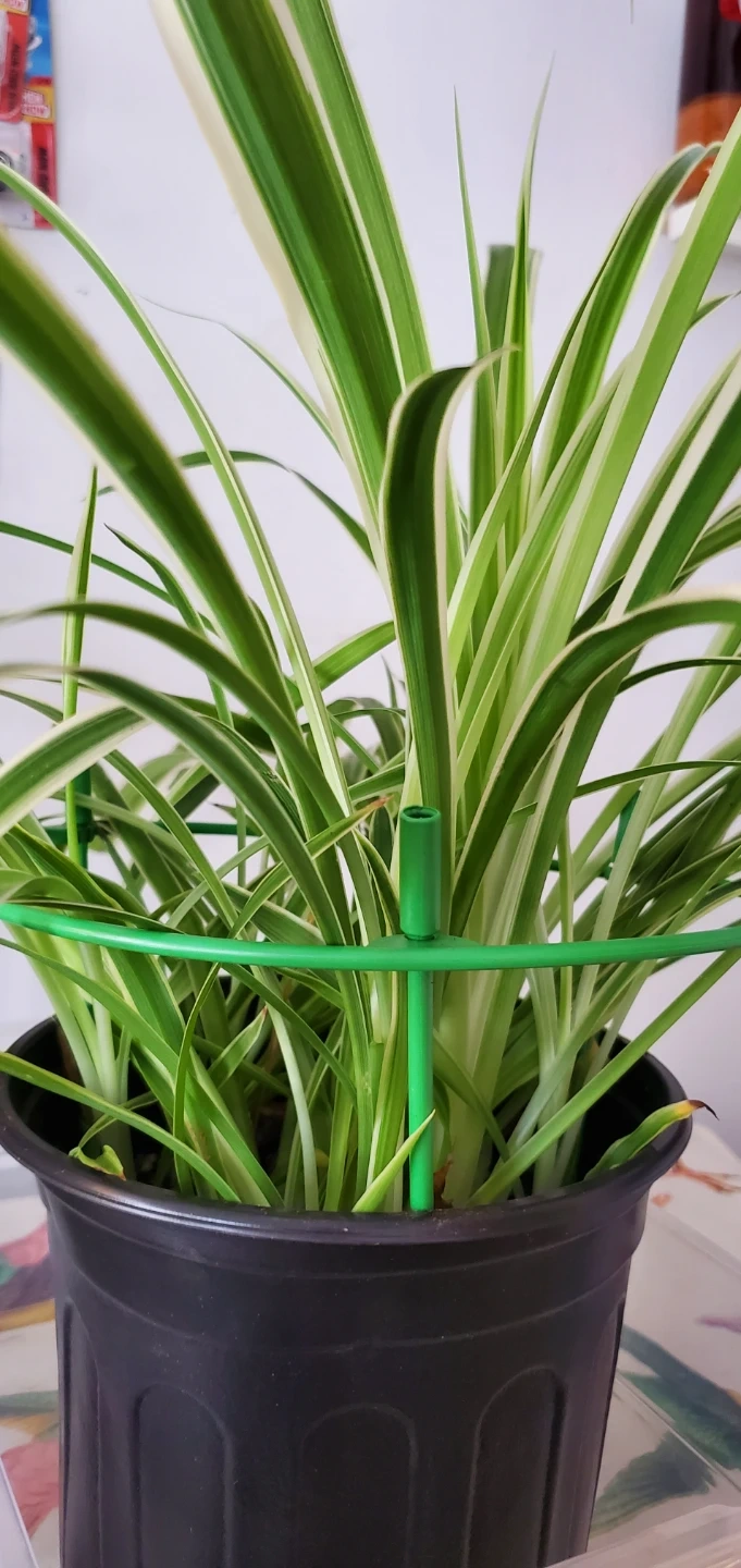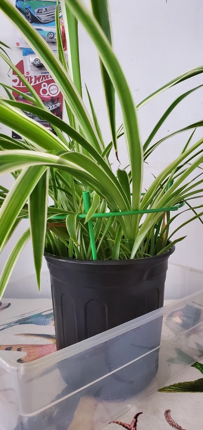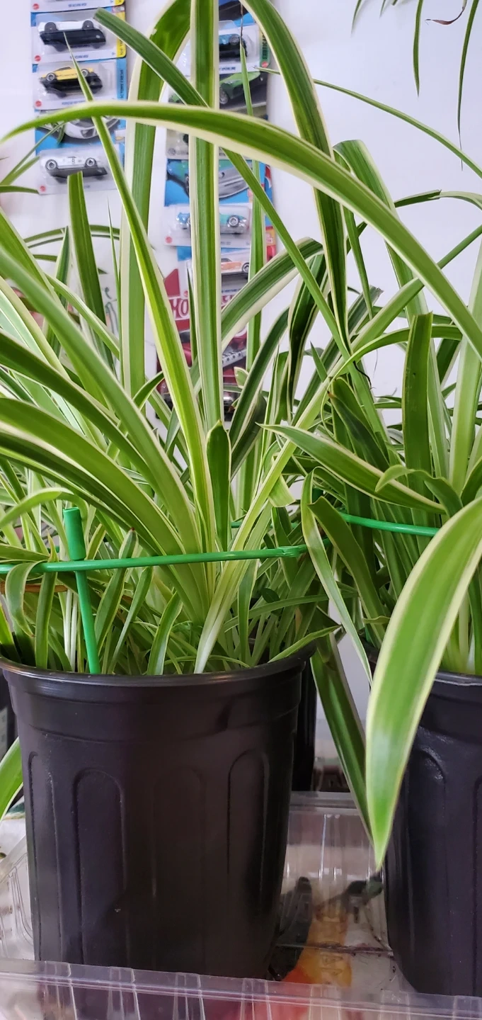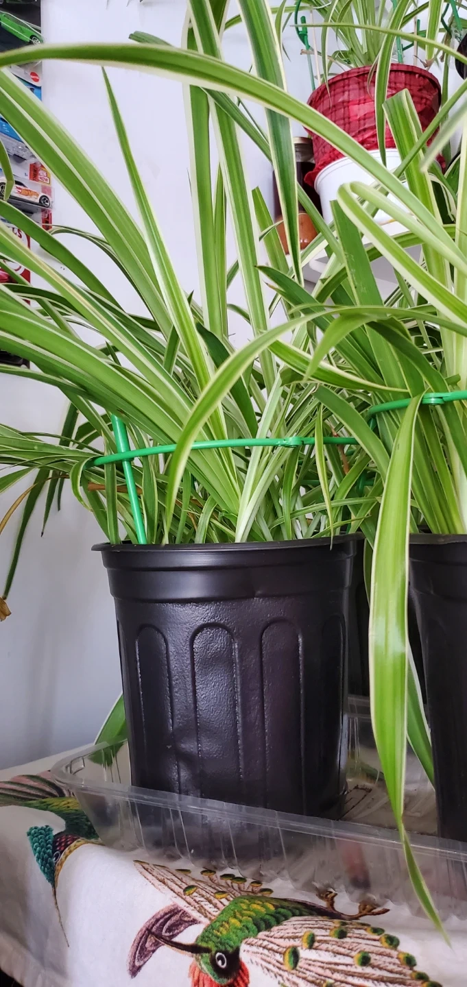 Healthy spider plant in a black pot. It's got variegated green and white leaves. This plant is easy to care for and can produce pups. Known for their ability to clear toxins from indoor air.